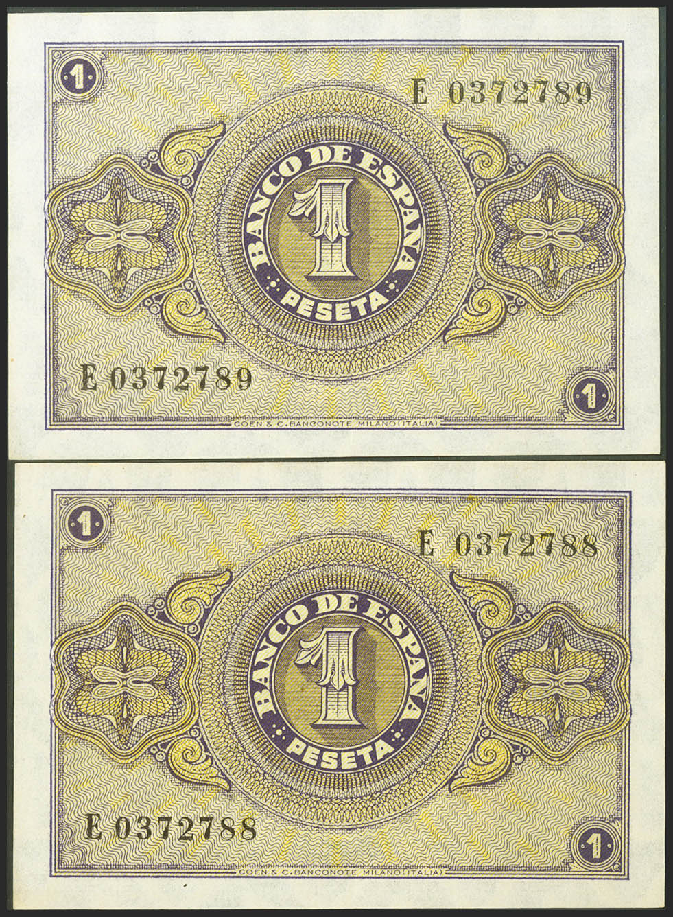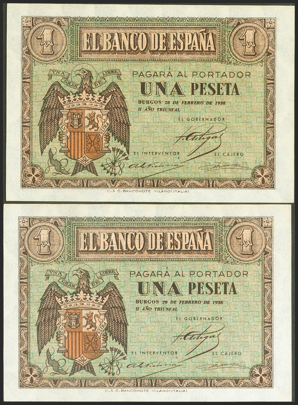 English 1 Peseta. February 28, 1938. Correlative couple. Series E. (Edifil 2021: 427a). Original sizing. Uncirculated.