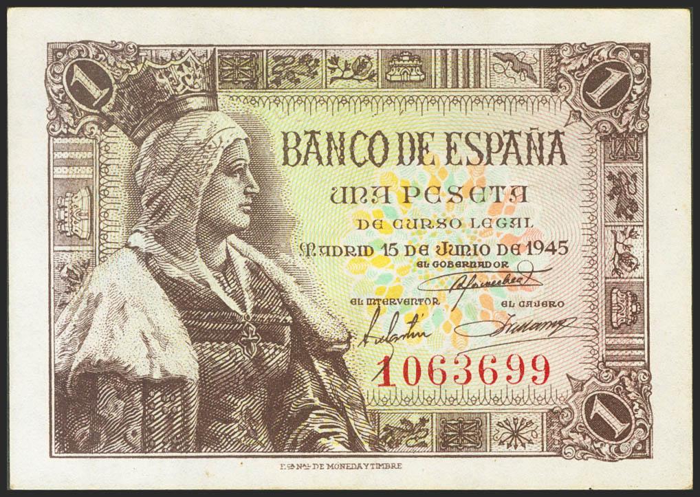 1 Peseta. June 15, 1945. No series. (Edifil 2021: 448). Original sizing. EBC++.