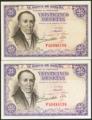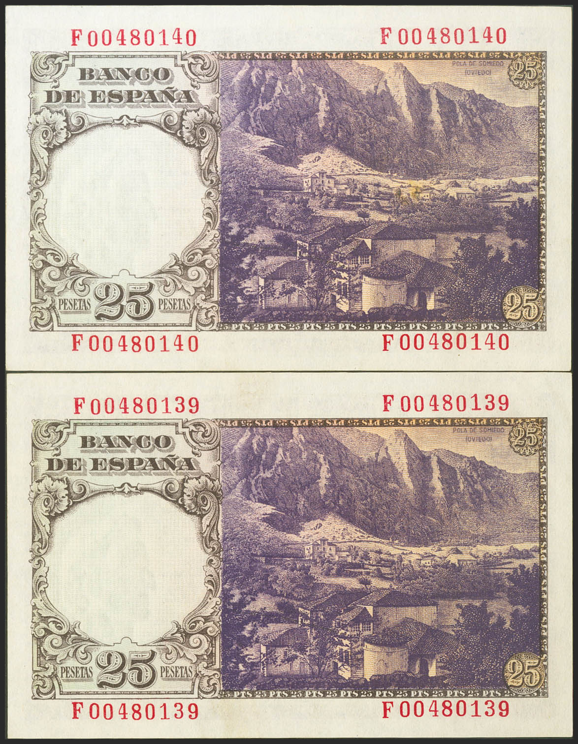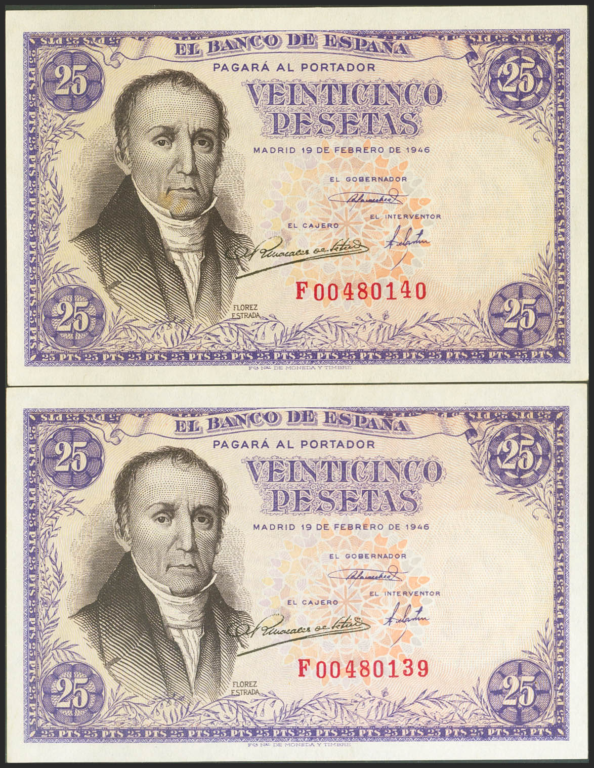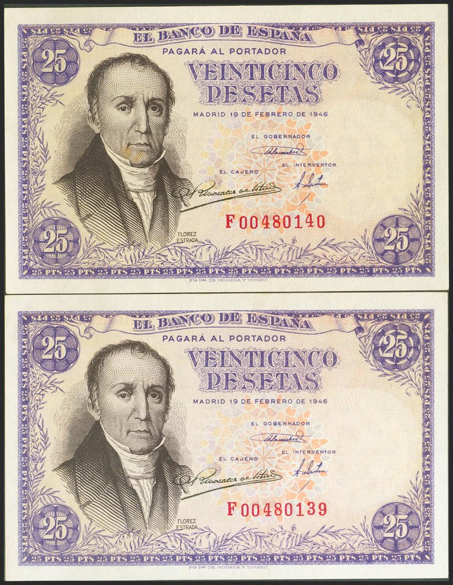 25 pesetas. February 19, 1946. Correlative pair, series F. (Edifil 2021: 450a). Original sizing. Almost Uncirculated.