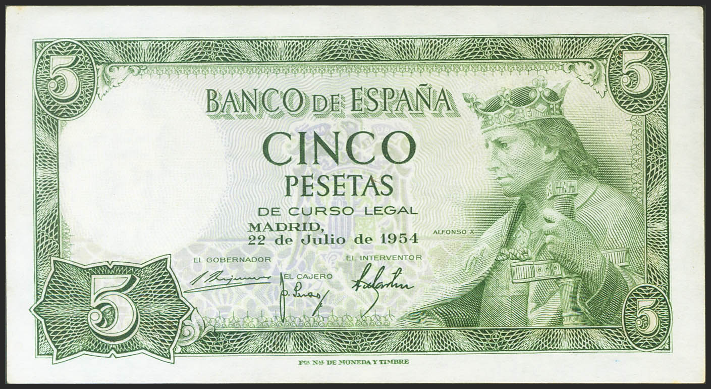 5 Pesetas. July 22, 1954. Series J. (Edifil 2021: 466a). Original finish. Uncirculated-.