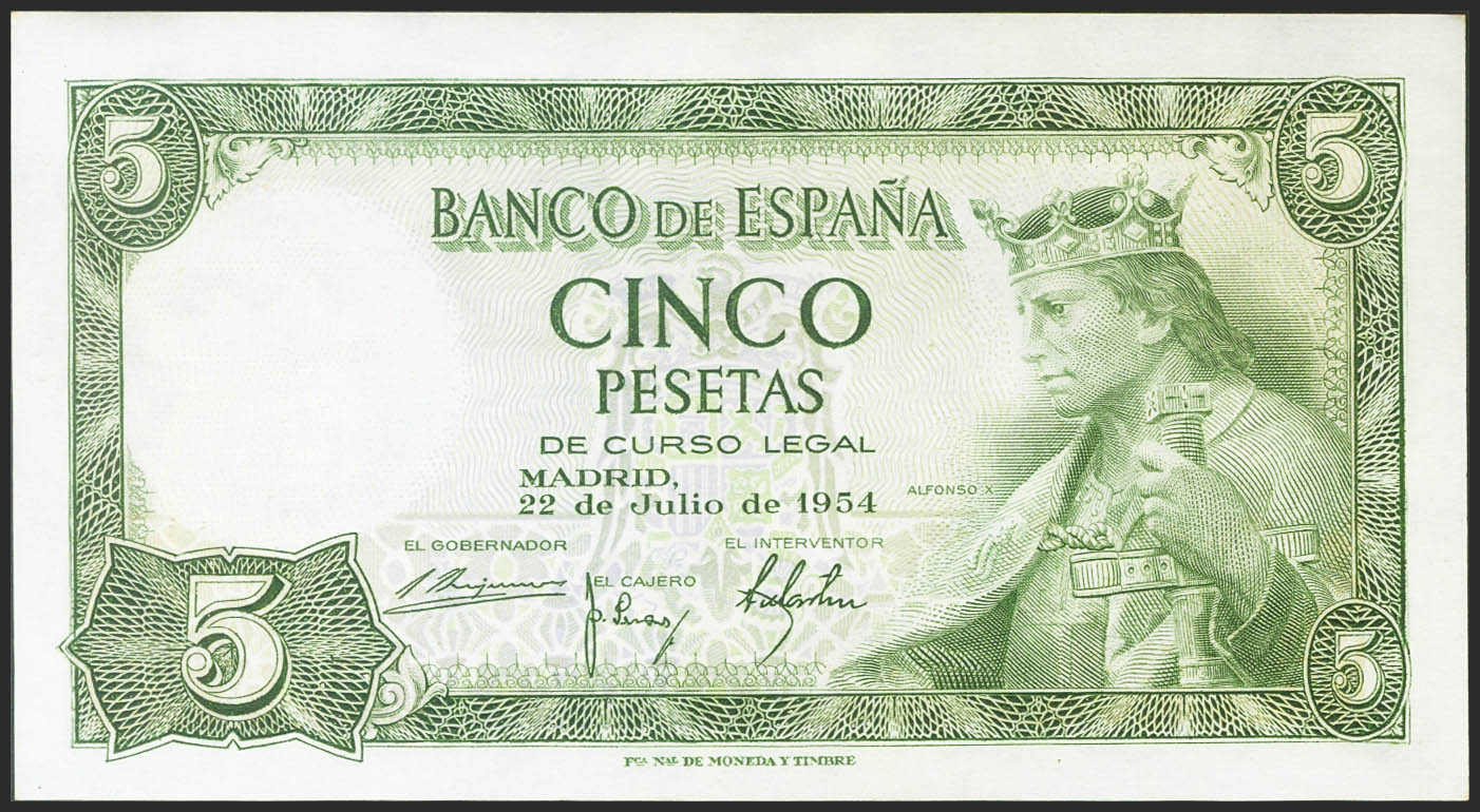 5 pesetas. July 22, 1954. Series P. (Edifil 2021: 466a). It retains much of its original sizing. EBC++.