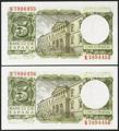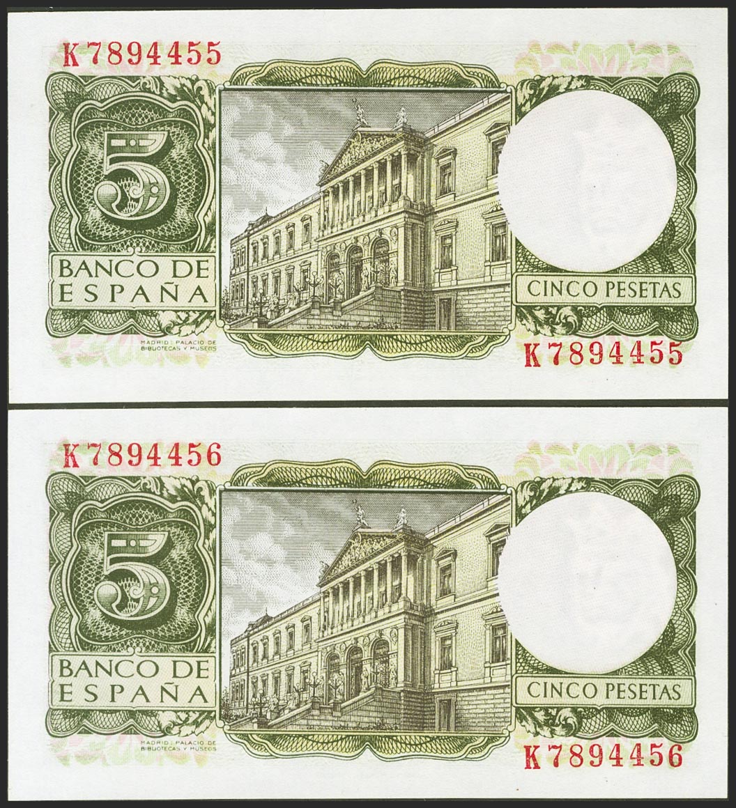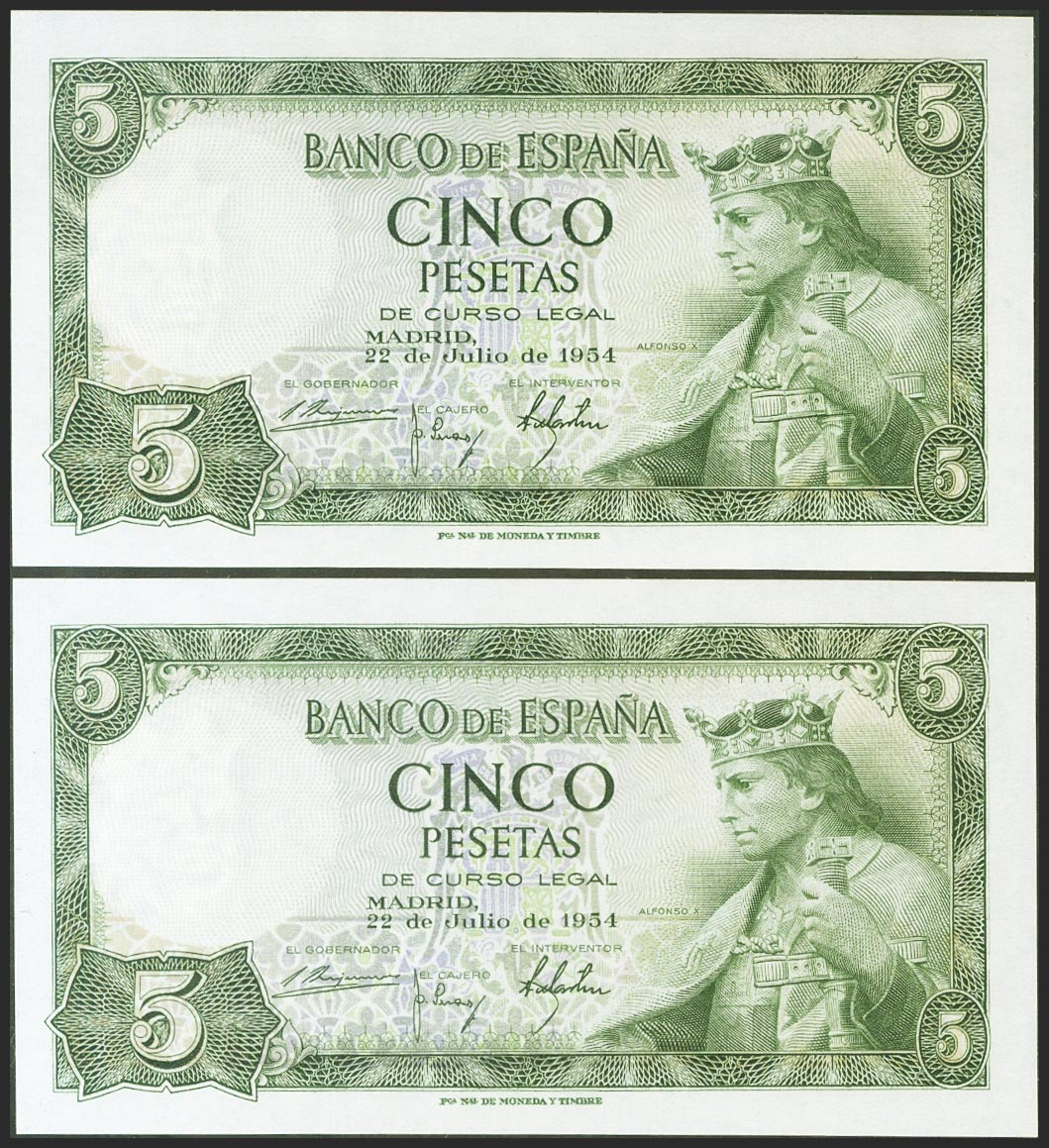 5 pesetas. July 22, 1954. Correlative couple. Series K. (Edifil 2021: 466a). Original sizing. Uncirculated.