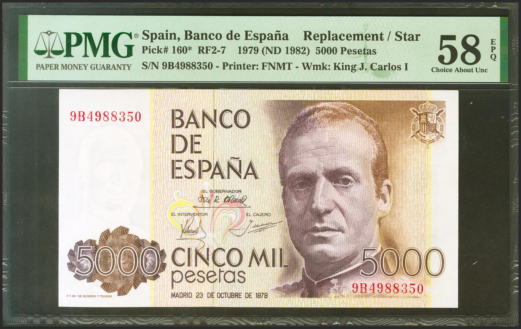 5000 Pesetas. October 23, 1979. Special series 9B. (Edifil 2021: 478b, Pick: 160*). Original sizing. EBC+++. PMG58EPQ package.