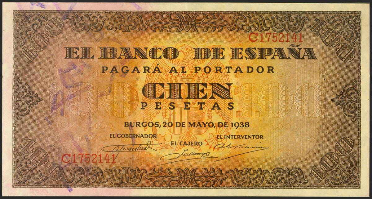 100 pesetas. May 20, 1938. Series C. (Edifil 2021: 432a). Retains much of the original sizing. Extremely Fine.