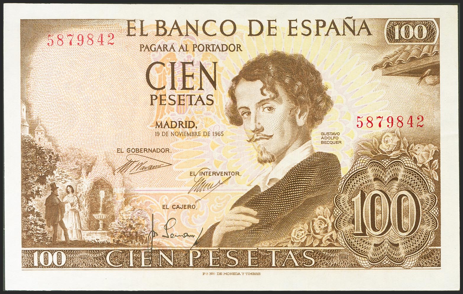 English 100 pesetas. November 19, 1965. No series. (Edifil 2021: 470). Original sizing. Almost Uncirculated.