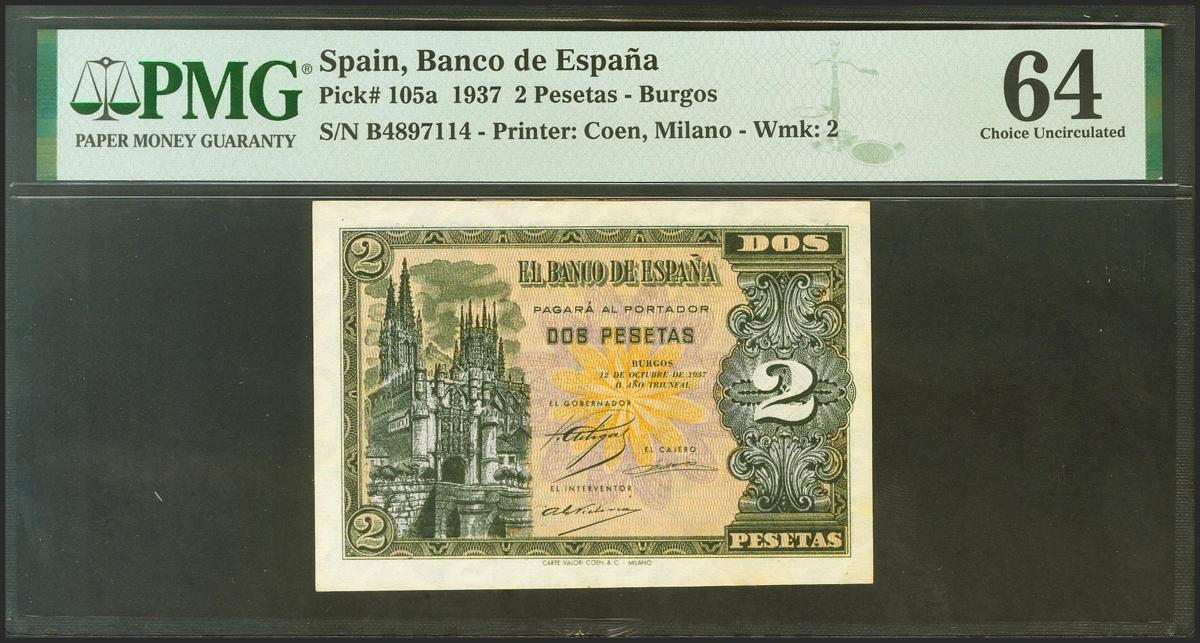 2 pesetas. October 12, 1937. Series B. (Edifil 2021: 426a, Pick: 105a). Unusual in this quality. Uncirculated. PMG64 package.