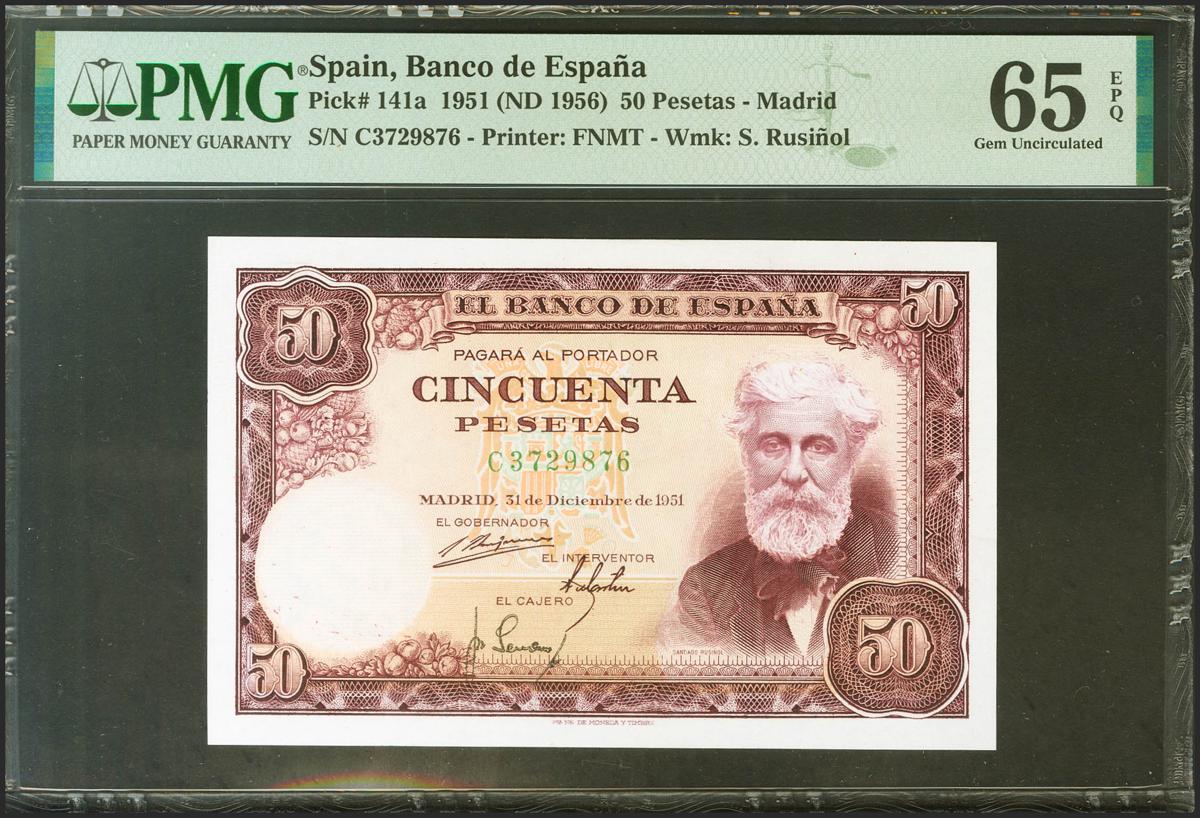 50 pesetas. December 31, 1951. Series C. (Edifil 2021: 462a, Pick: 141a). Rare in this quality, original sizing. Uncirculated. PMG65EPQ package.