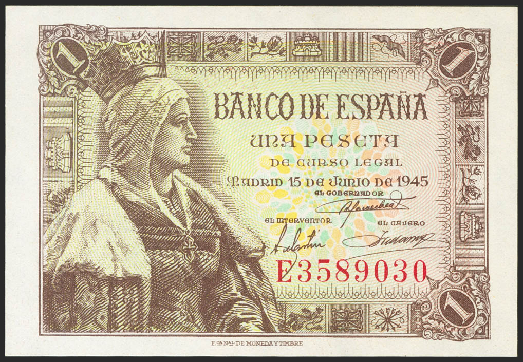 1 peseta. June 15, 1945. Series E. (Edifil 2021: 448a). original sizing Uncirculated.