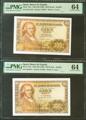 100 Pesetas. May 2, 1948. Correlative pair. Series I, last series issued. (Edifil 2023: 456b, Pick: 137a). Uncirculated. PMG64 encapsulation.