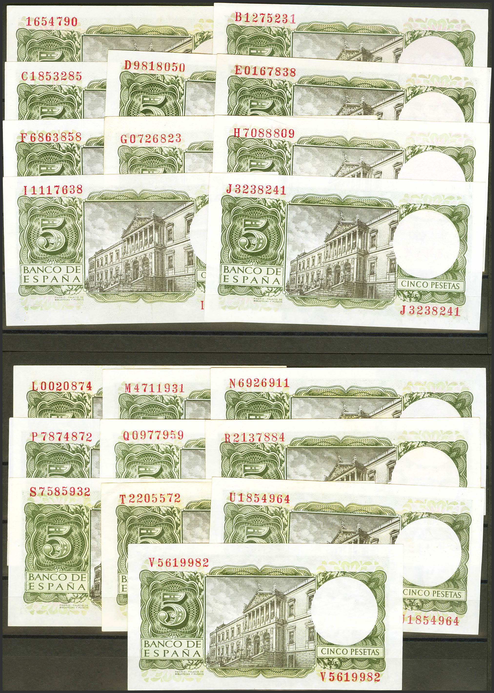 Beautiful set of 20 5 Pesetas banknotes issued on July 22, 1954, including all the letters of the initial series, except A, K and W, and including the one without series (Without series Extremely Fine-, B Extremely Fine-, C Good Extremely Fine, D Good Extremely Fine and with ink annotations, E Extremely Fine, F Extremely Fine, G Extremely Fine, H Extremely Fine, I Extremely Fine-, J Extremely Fine, L Good Extremely Fine, M Extremely Fine, N Extremely Fine, P Extremely Fine, Q Extremely Fine, R Extremely Fine, S Extremely Fine, T Extremely Fine, U Extremely Fine, V Extremely Fine). (Edifil 2021: 466, 466a). Unusual set.