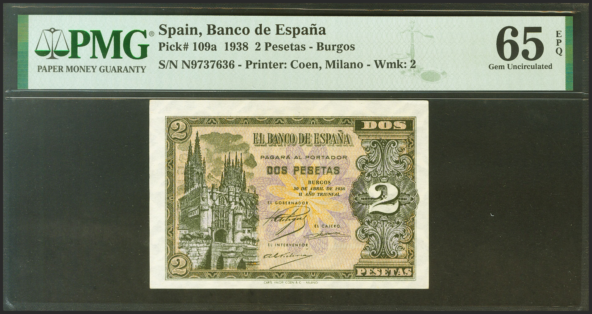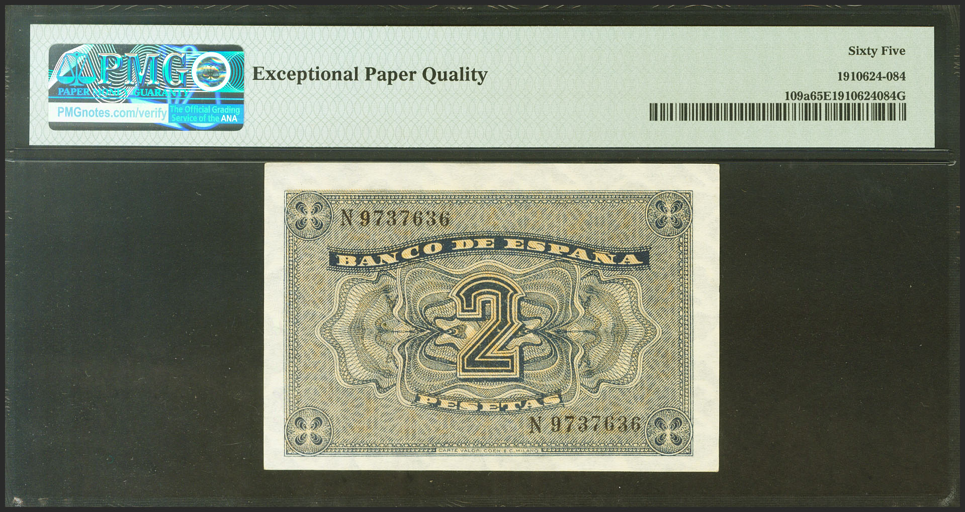2 Pesetas. 30 de Abril de 1938. Serie N, ultima serie emitida. (Edifil 2021: 429a, Pick: 109a). Inusual en esta excepcional calidad, apresto original. SC. Encapsulado PMG65EPQ.