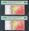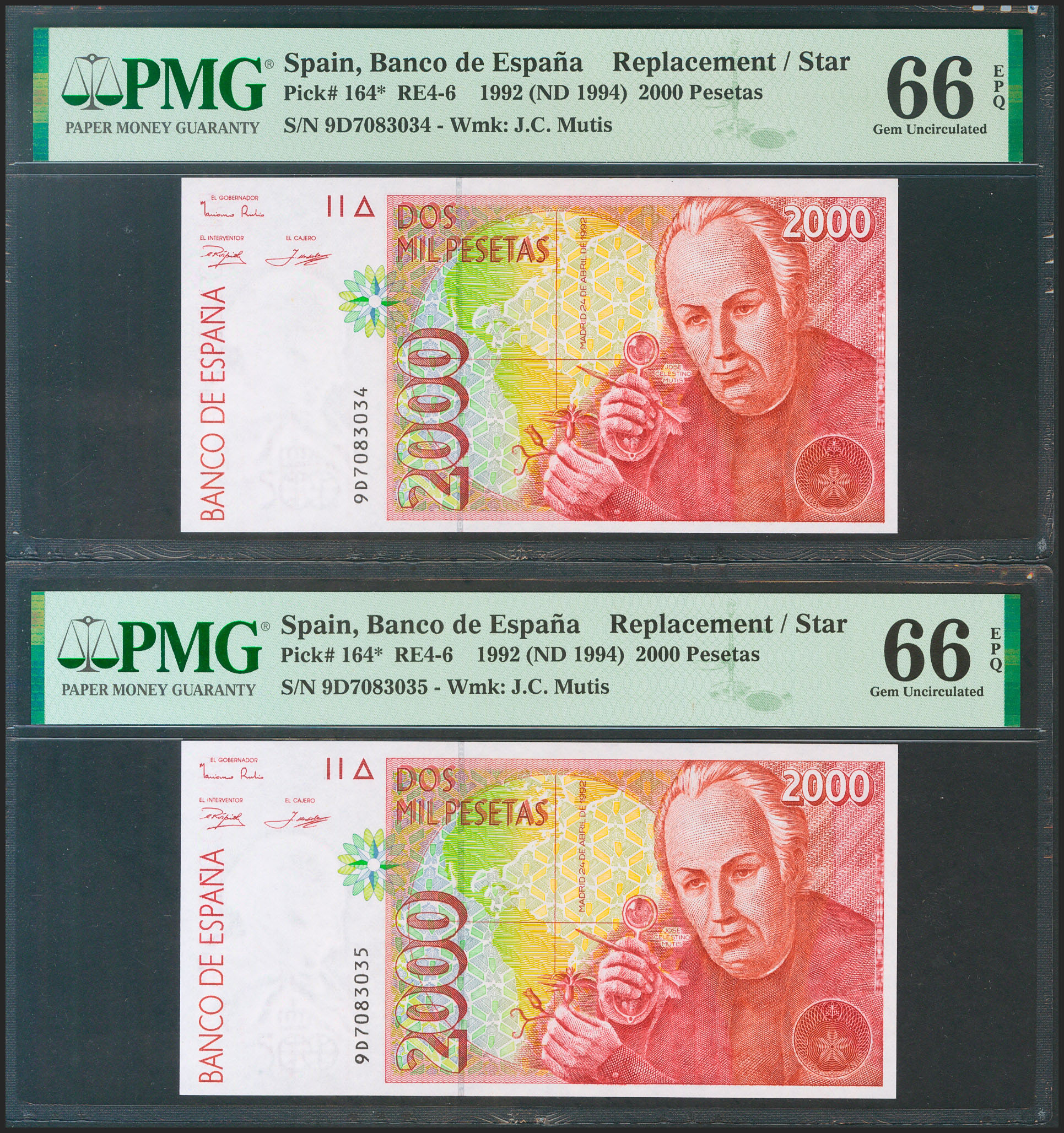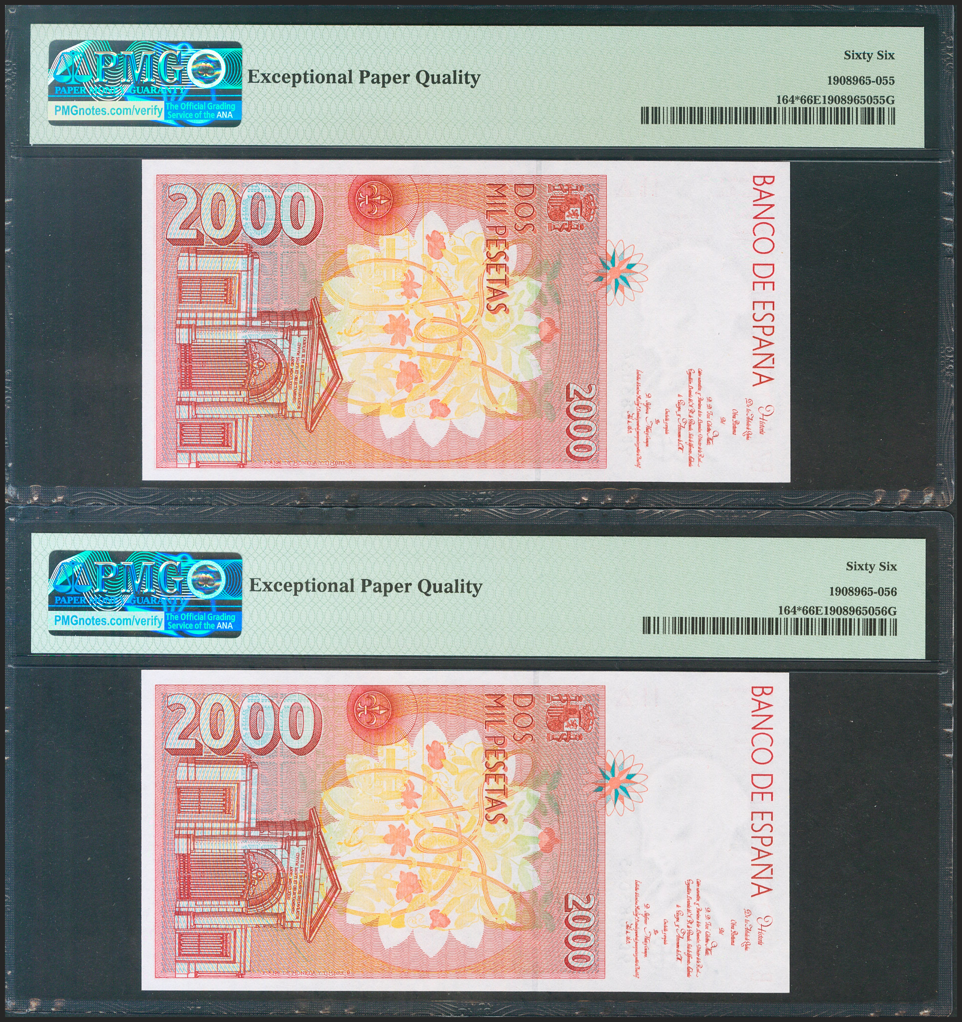 2000 Pesetas. April 24, 1992. Correlative couple. 9D special series. (Edifil 2021: 482Ab, Pick: 164*). Very rare in this exceptional quality, original finish. Uncirculated. PMG66EPQ package, both.