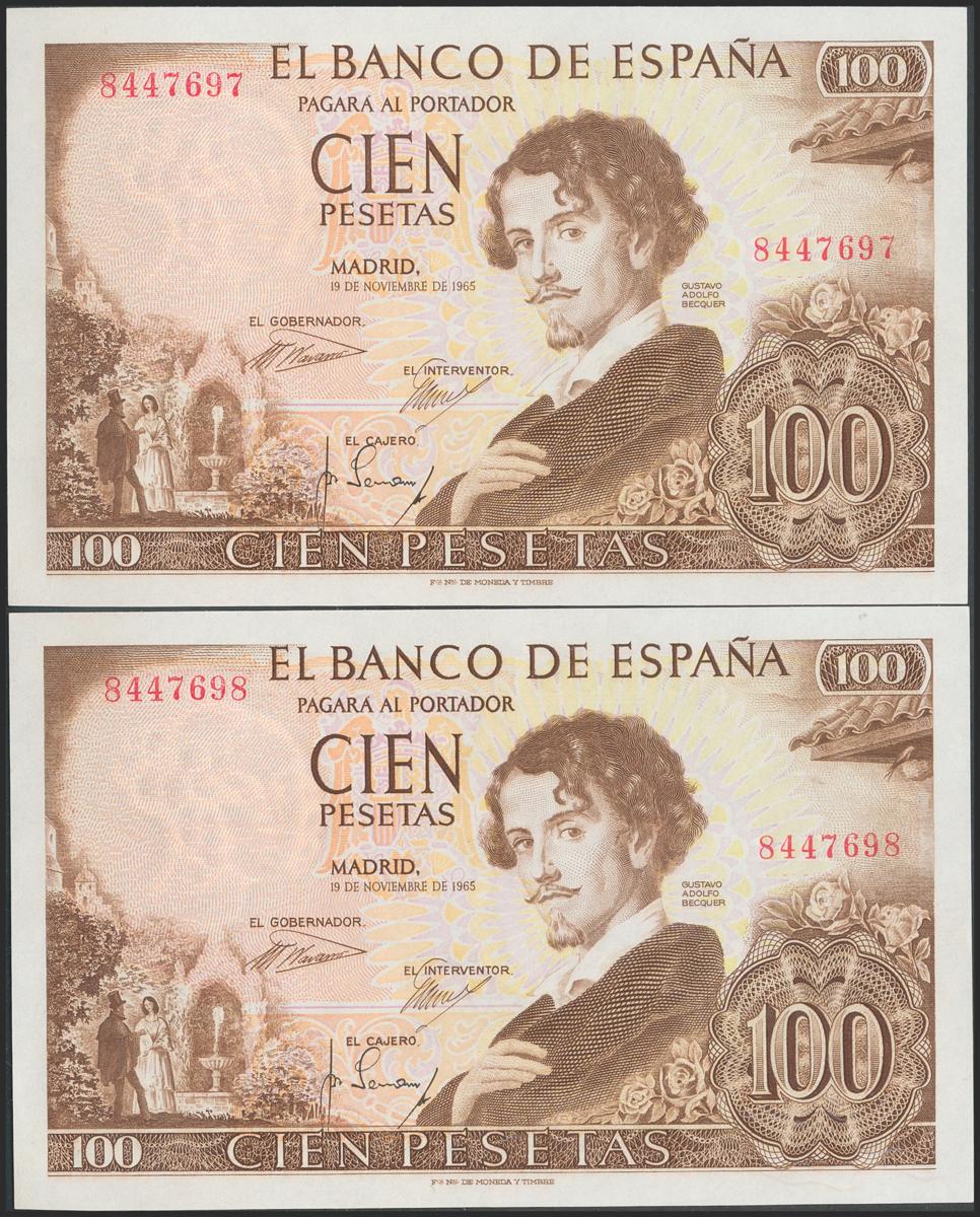 English 100 Pesetas. November 19, 1965. Correlative couple. No serie. (Edifil 2017: 470). Original sizing. Uncirculated.