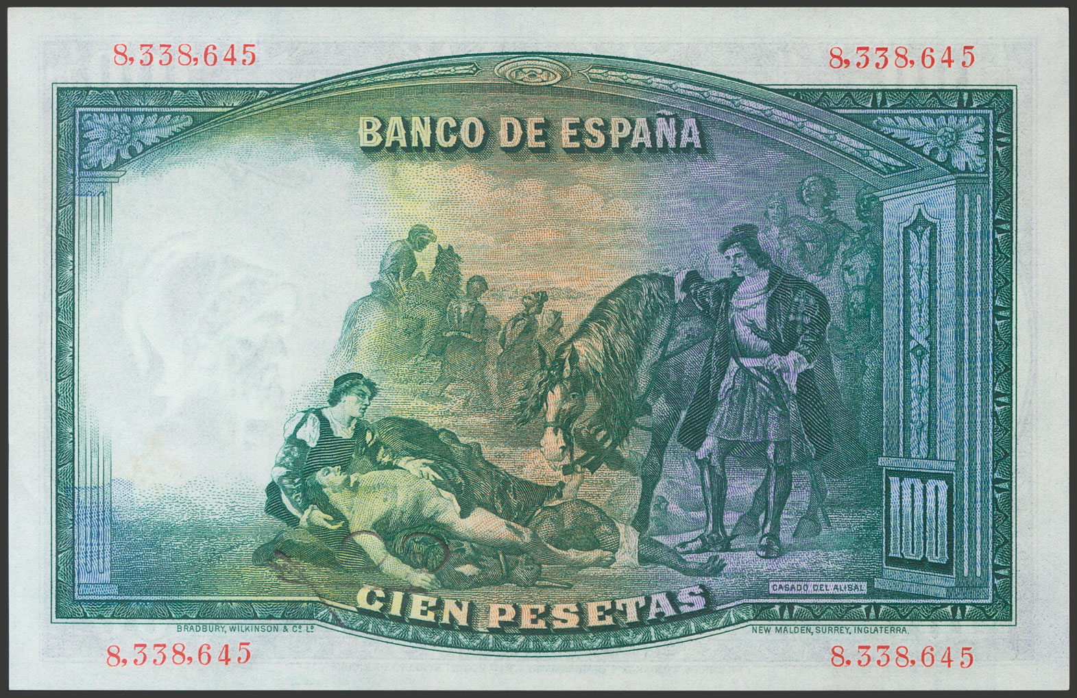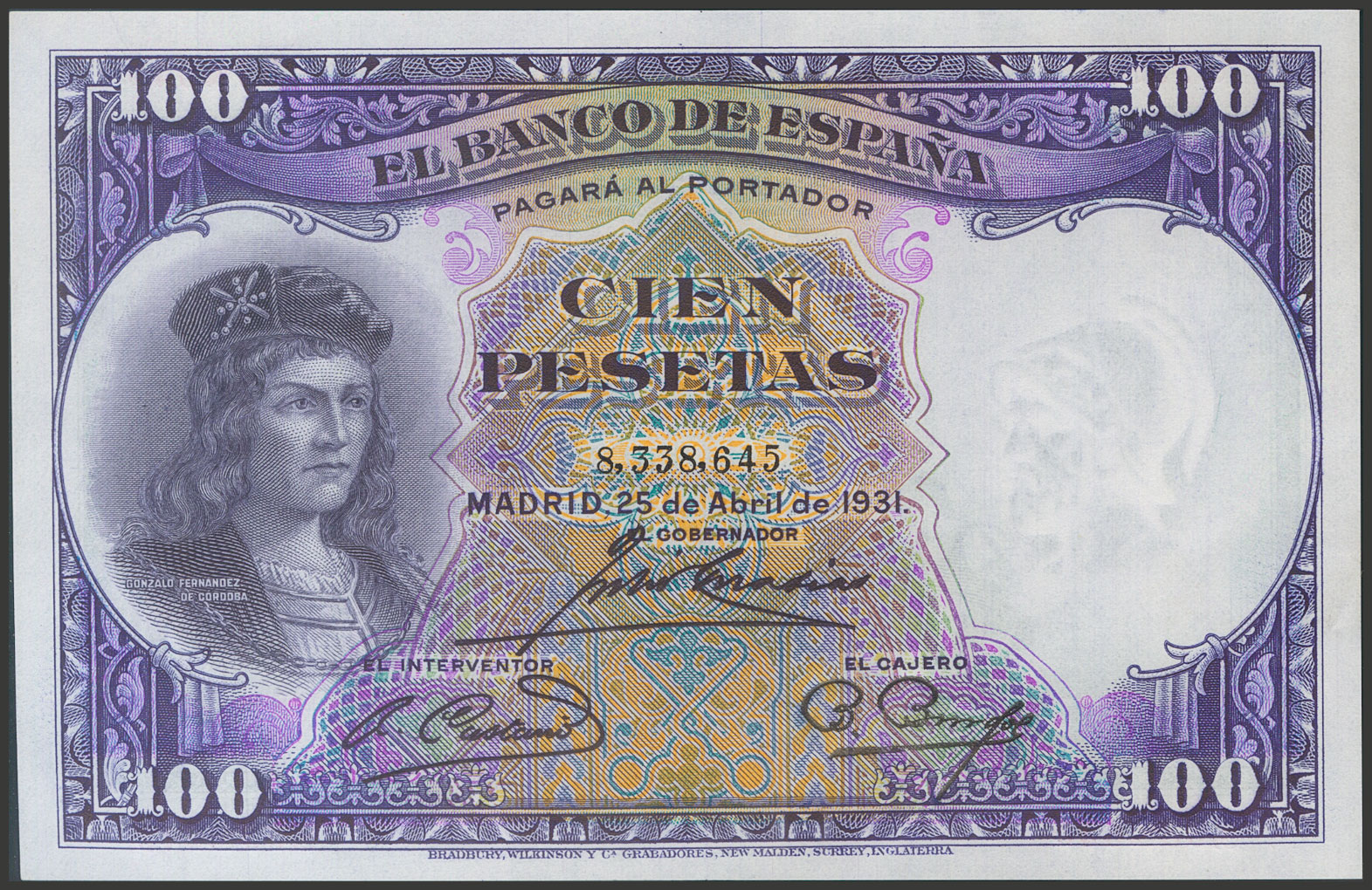 100 Pesetas. April 25, 1931. No series. (Edifil 2017: 360). It retains all its original finish. Almost Uncirculated.