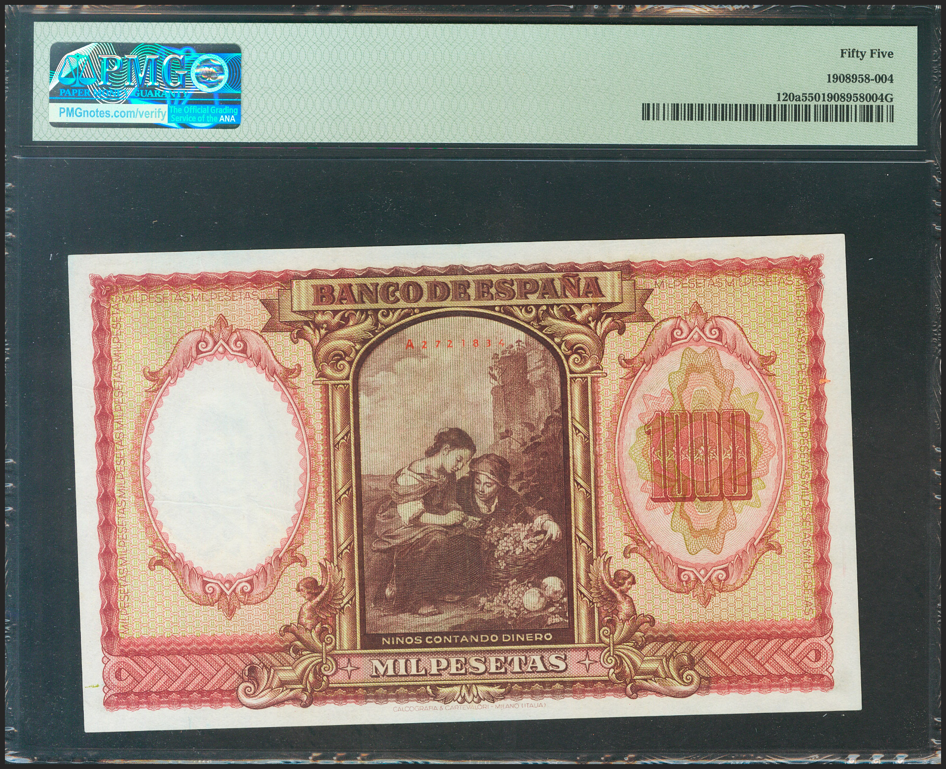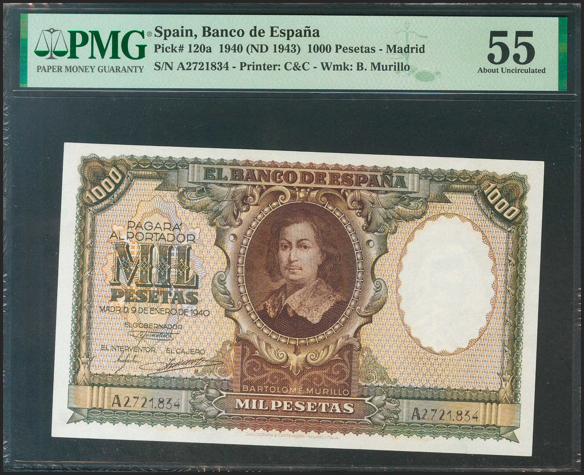 English 1000 Pesetas. January 9, 1940. Series A. (Edifil 2021: 440, Pick: 120a). Rare in this quality. Good Extremely Fine. PMG55 encapsulation.
