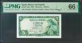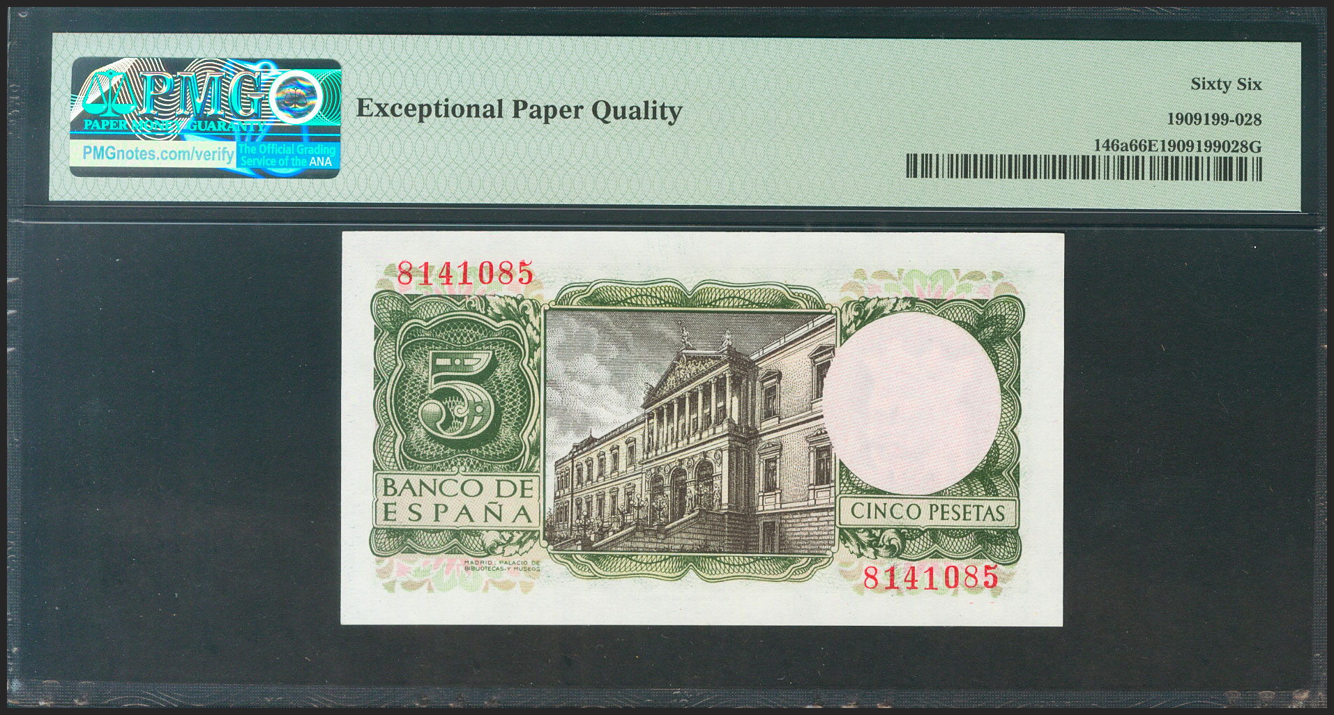 5 Pesetas. July 22, 1954. No series. (Edifil 2021: 466, Pick: 146a). Rare in this quality, original sizing. Uncirculated. PMG66EPQ package.