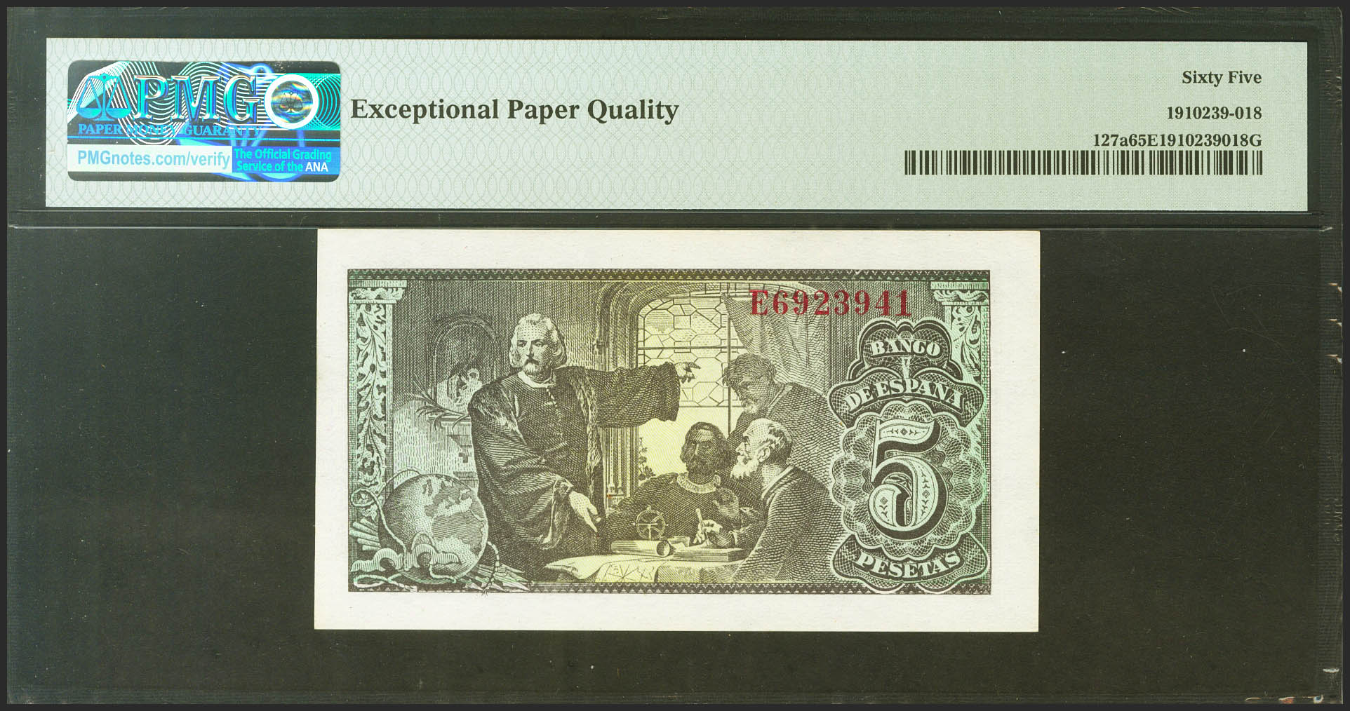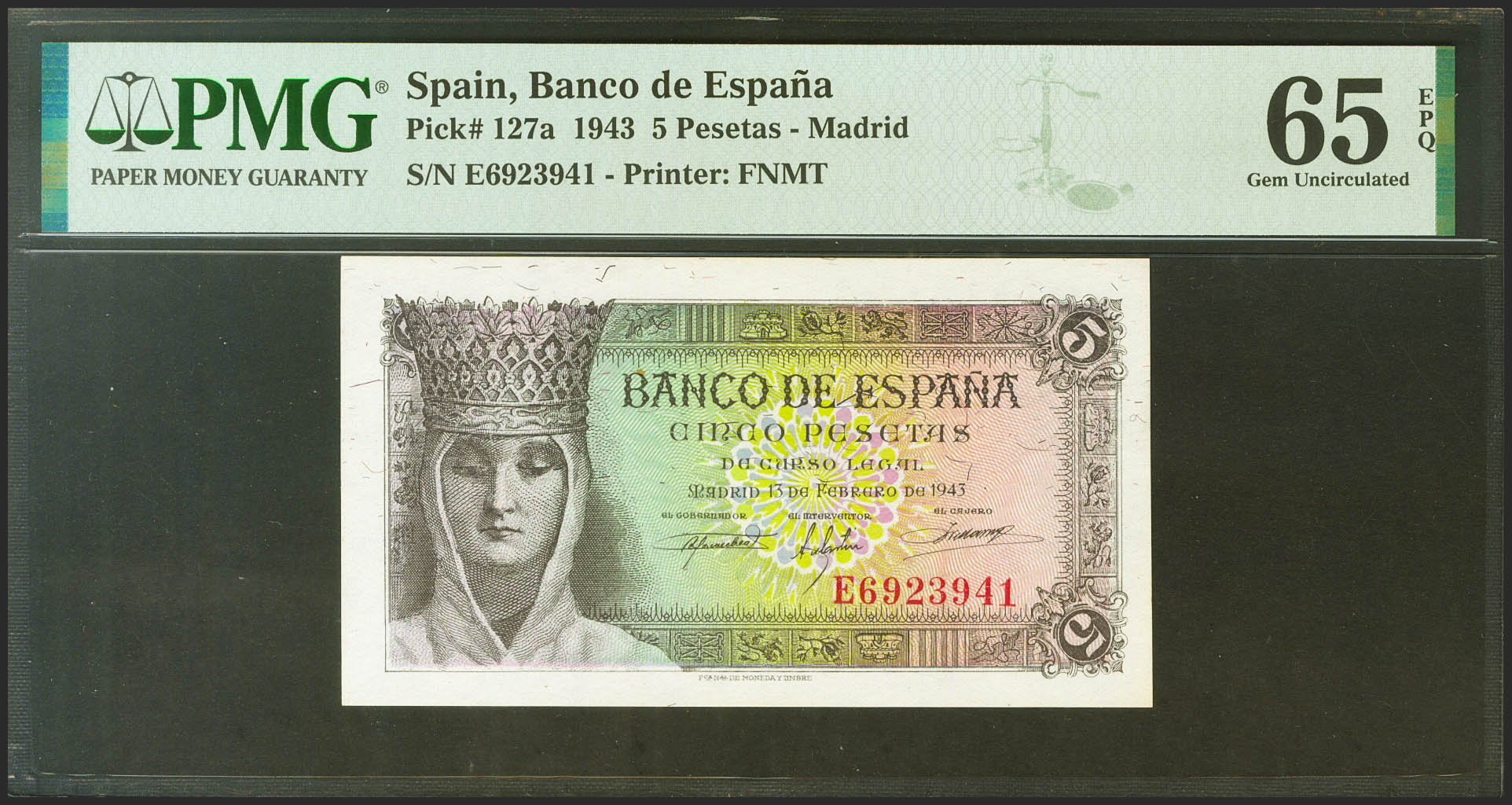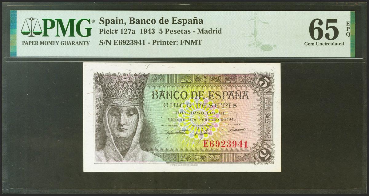 5 Pesetas. February 13, 1943. Series E. (Edifil 2021: 446a, Pick: 127a). Original sizing. Uncirculated. PMG65EPQ package.