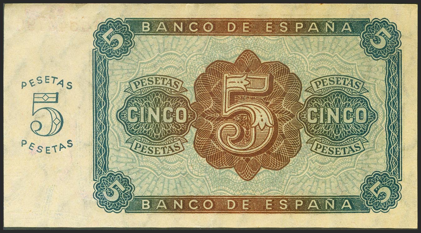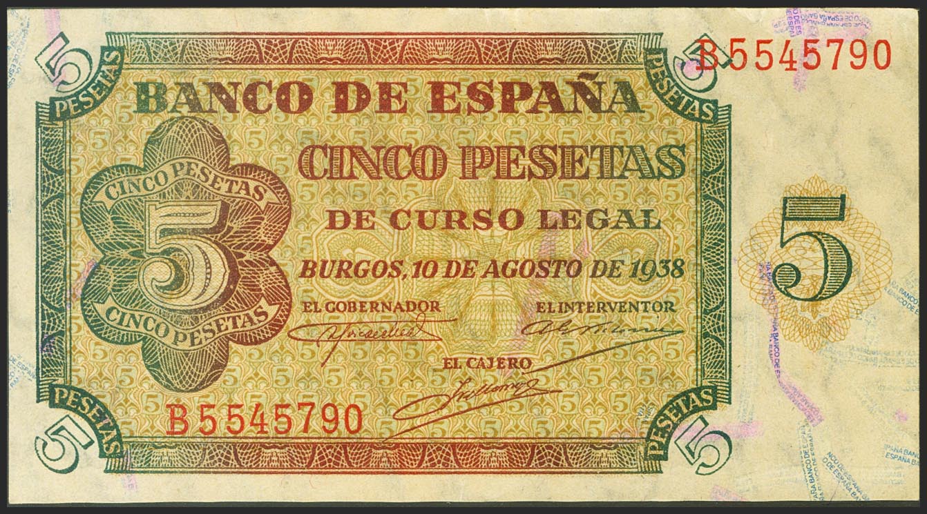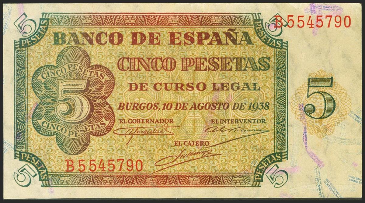5 Pesetas. August 10, 1938. Series B. (Edifil 2021: 435a). Original sizing. Almost Uncirculated.