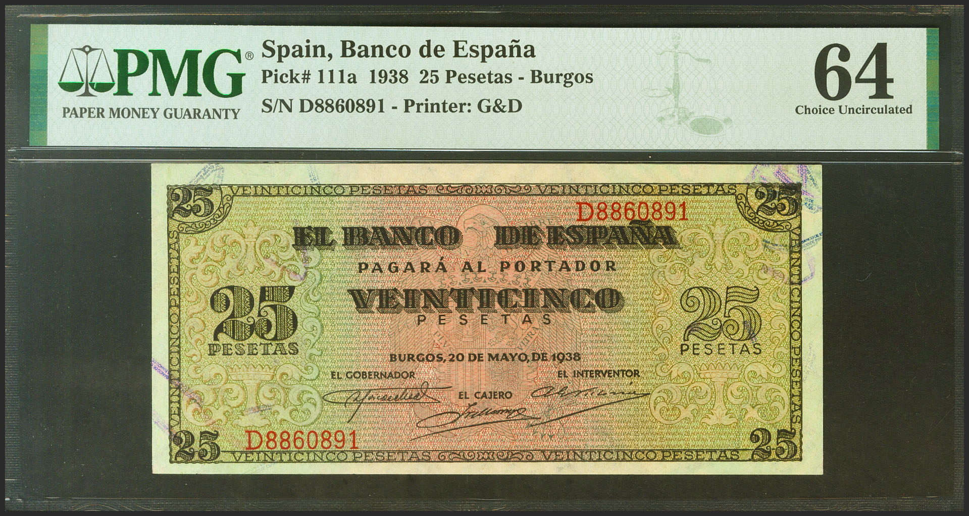 25 Pesetas. May 20, 1938. Series D. (Edifil 2021: 430a, Pick: 111a). Unusual. Uncirculated. PMG64 encapsulation.