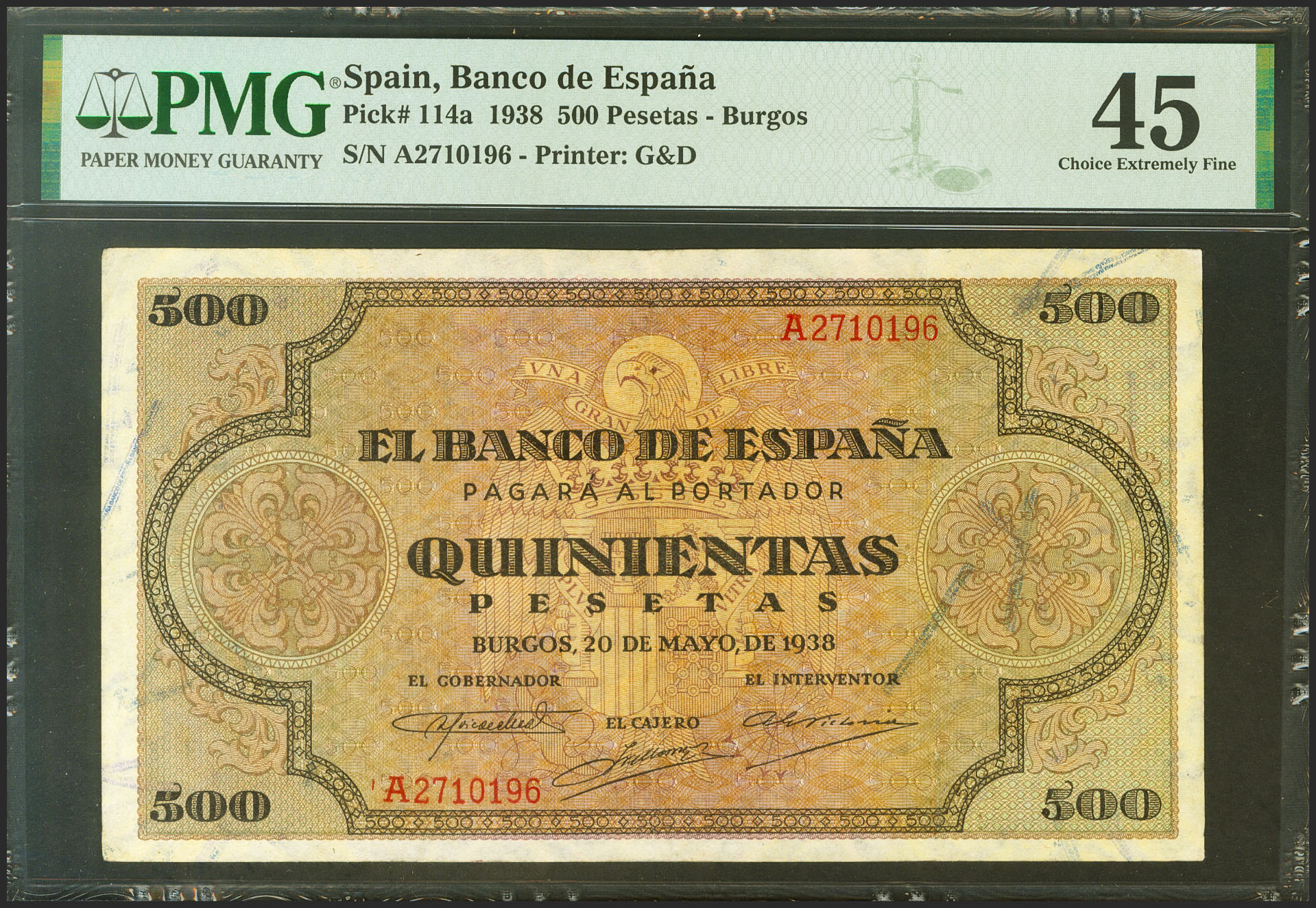 500 Pesetas. May 20, 1938. Series A. (Edifil 2021: 433, Pick: 114a). Unusual. Almost Extremely Fine. PMG45 encapsulated.