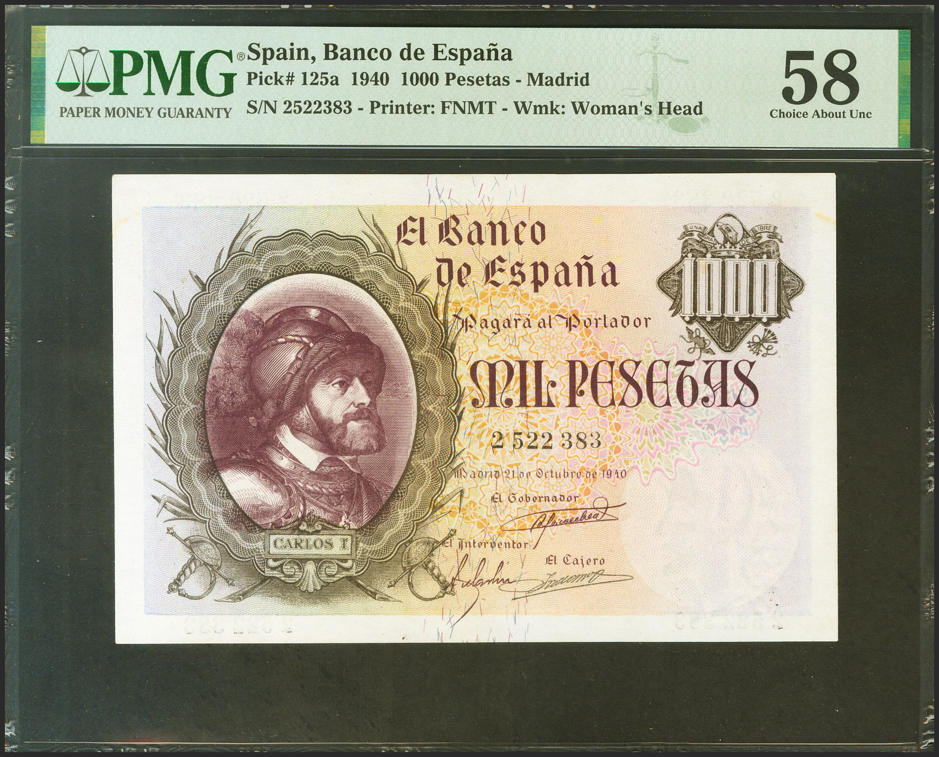 1000 Pesetas. October 21, 1940. No series. (Edifil 2021: 445, Pick: 125a). Unusual in this quality. EBC++. PMG58 encapsulation.