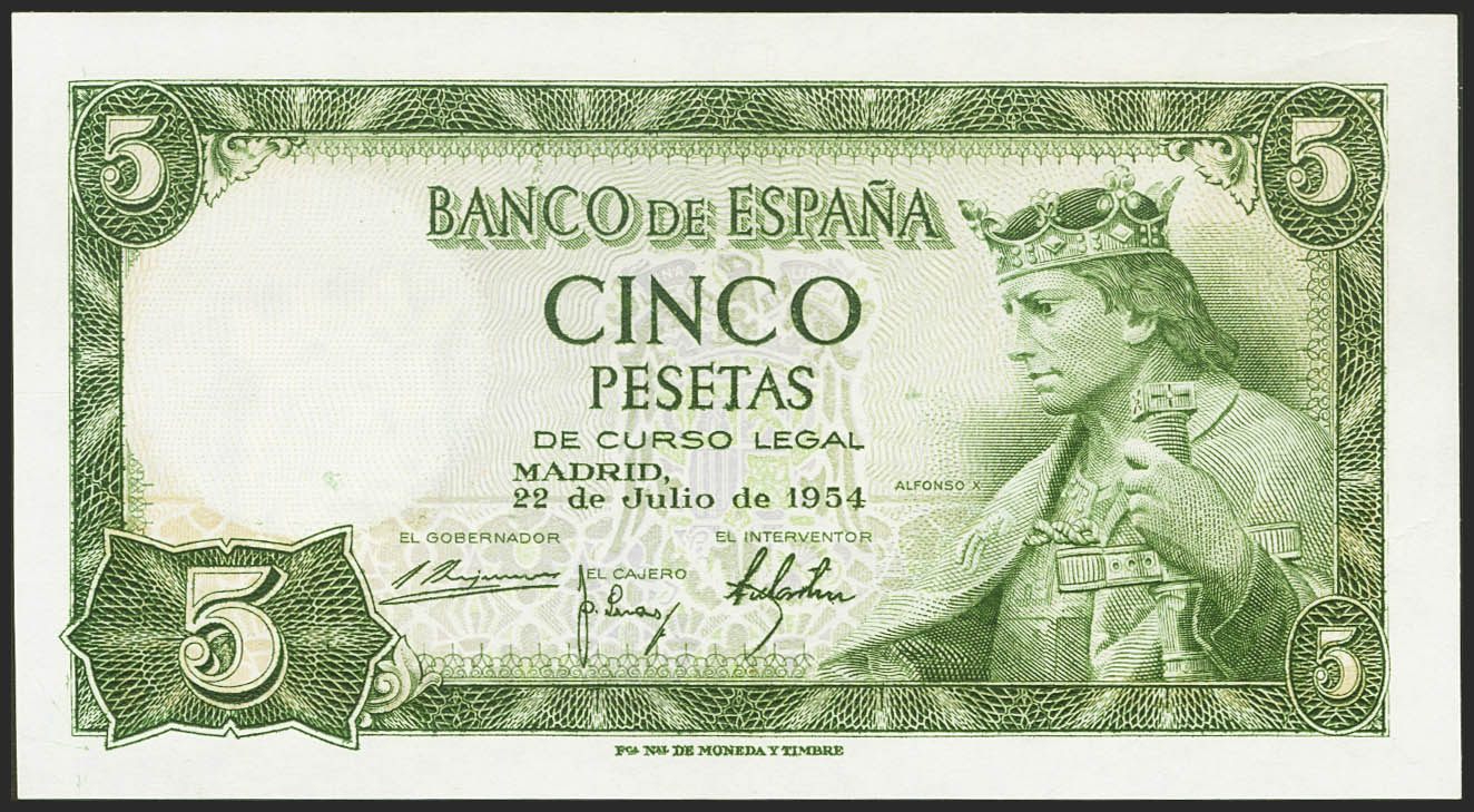 5 Pesetas. July 22, 1954. Series R. (Edifil 2021: 466a). Original sizing. Uncirculated.