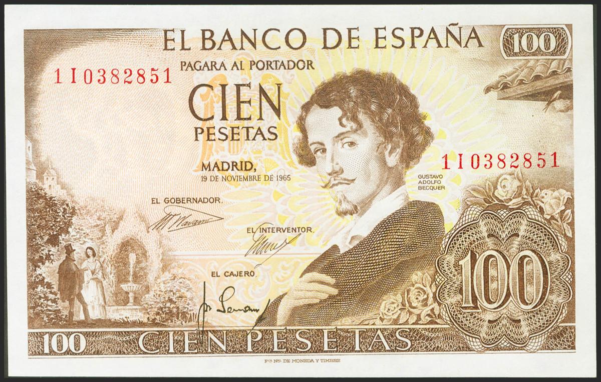 100 Pesetas. November 19, 1965. Series 1I. (Edifil 2021: 470a). It retains all its original finish. Almost Uncirculated.