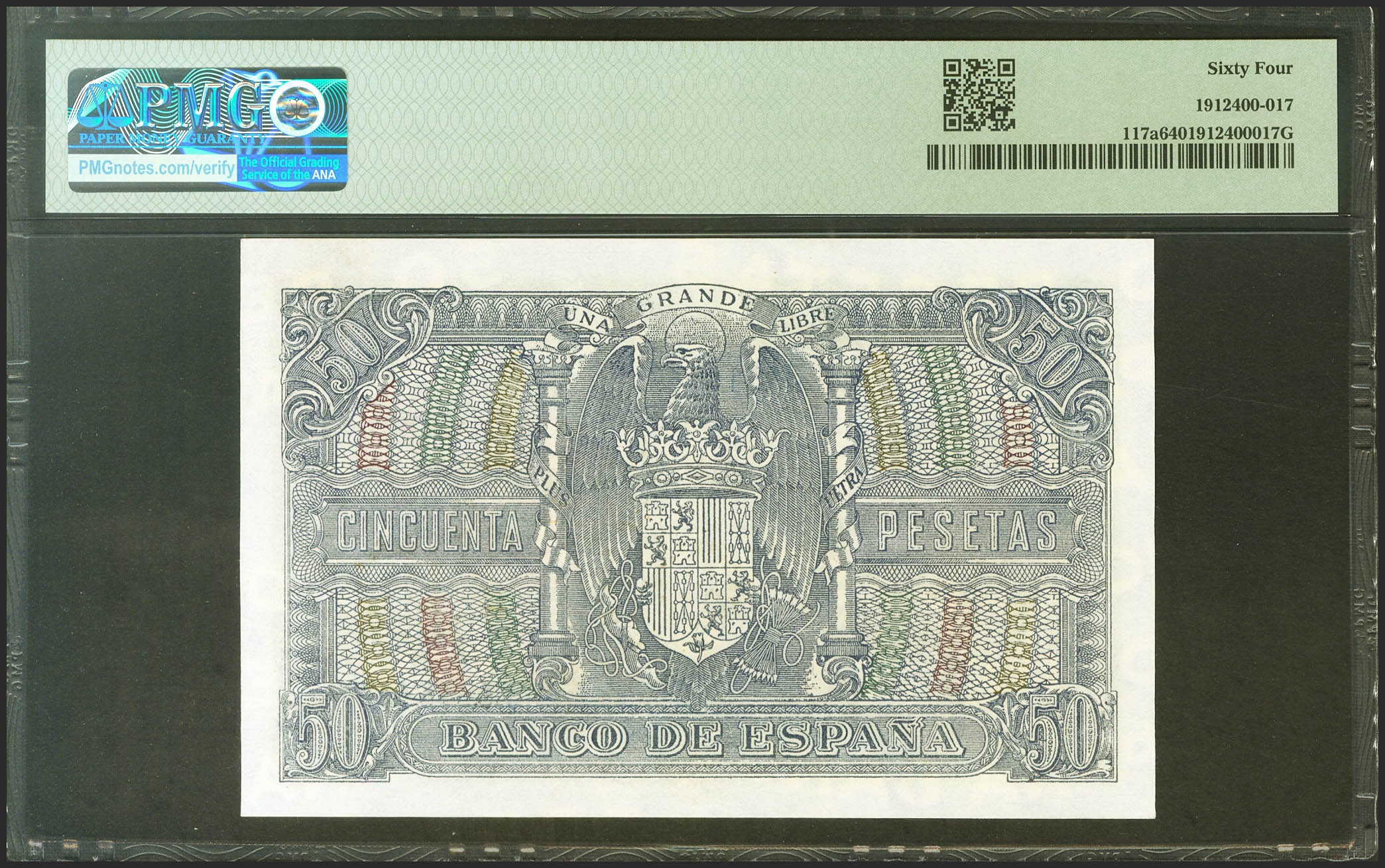 50 Pesetas. January 9, 1940. Series B. (Edifil 2021: 437a, Pick: 117a). Unusual in this quality. Uncirculated. PMG64 encapsulation.