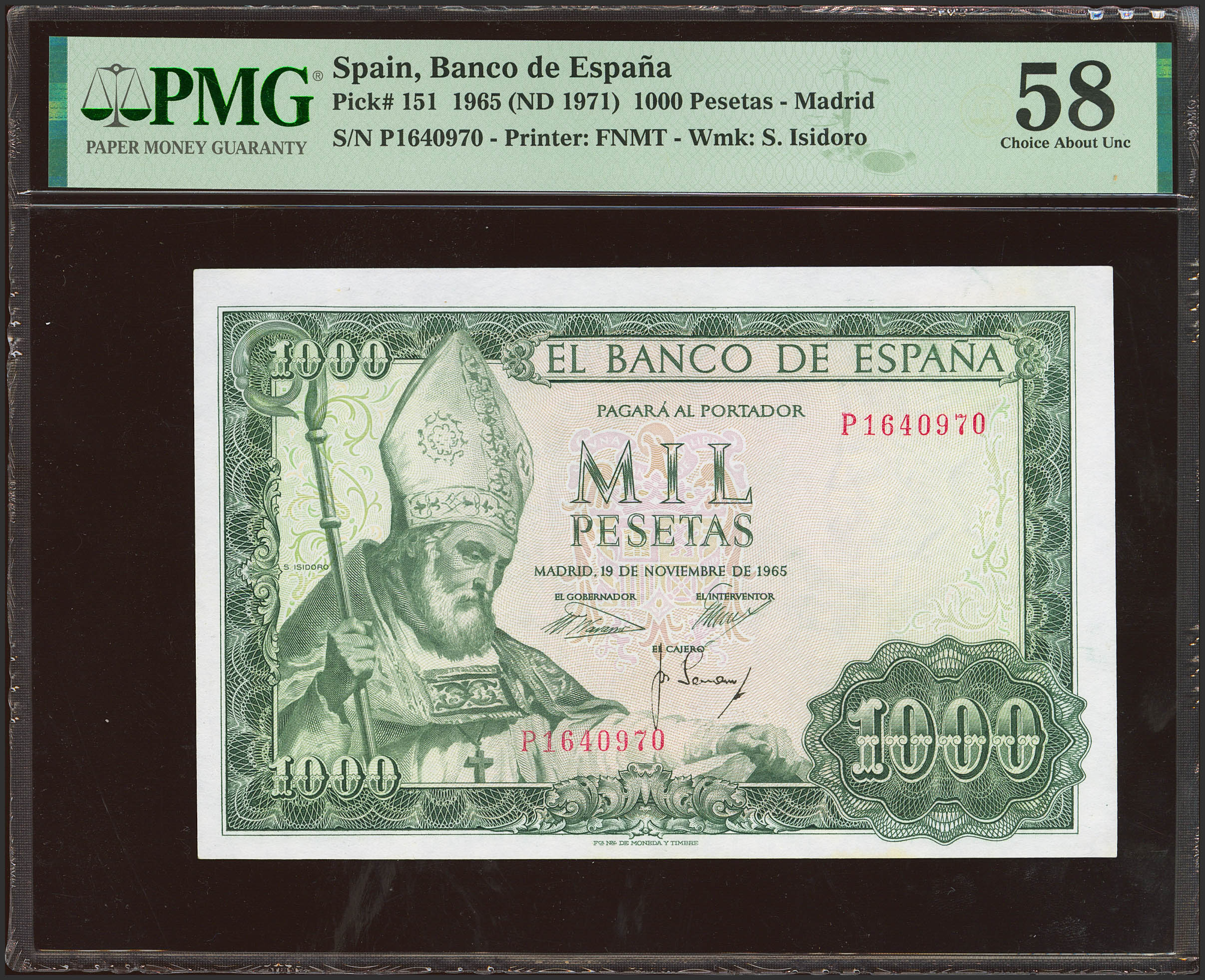 1000 Pesetas. November 19, 1965. Series P. (Edifil 2021: 471b, Pick: 151). EBC++. PMG58 encapsulation.