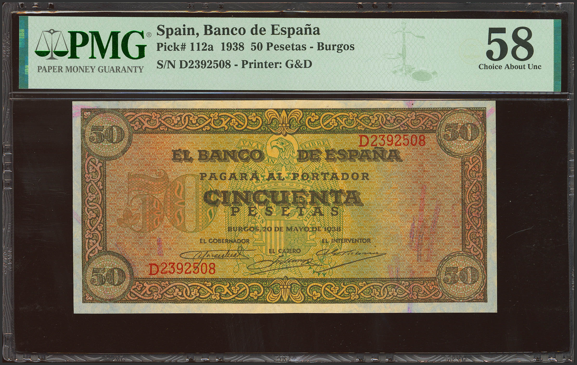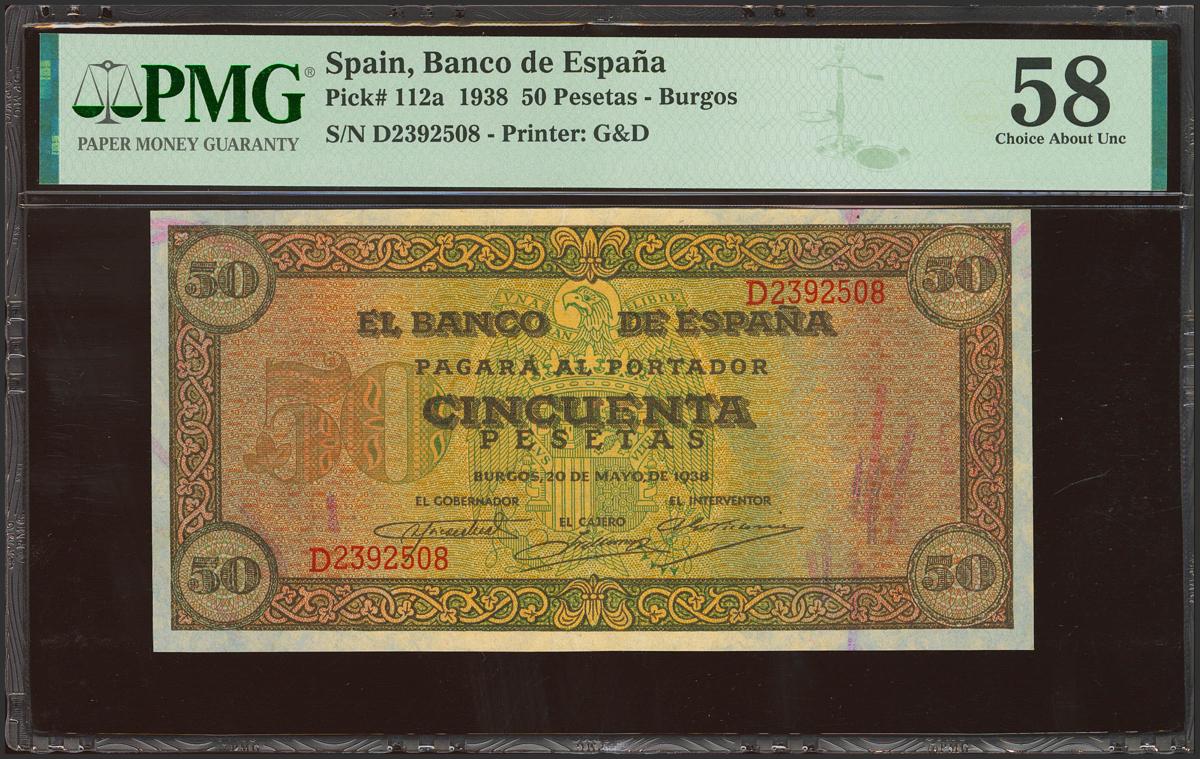 50 Pesetas. May 20, 1938. Series D. (Edifil 2021: 431a, Pick: 112a). EBC++. PMG58 encapsulation.