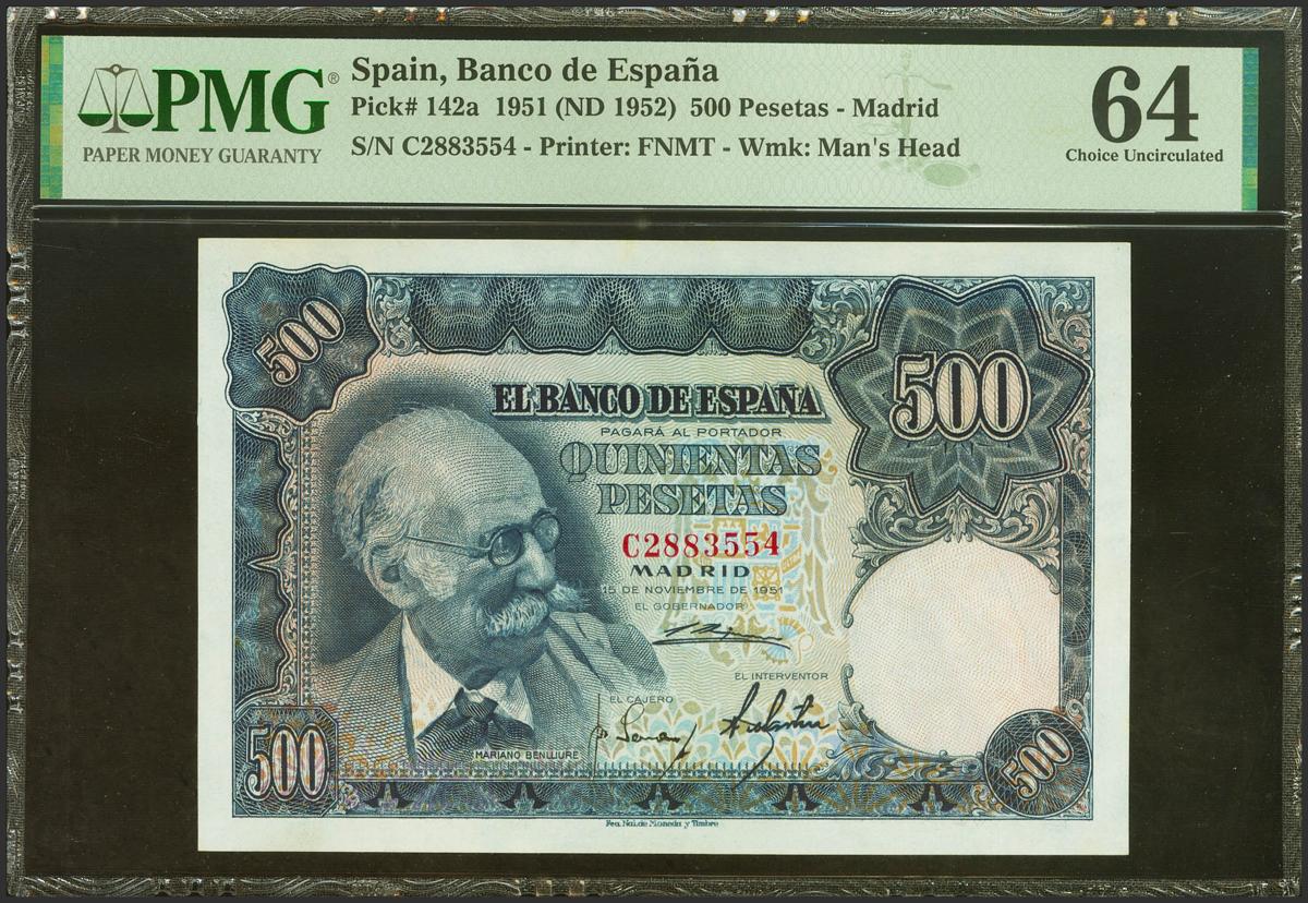 English 500 Pesetas. November 15, 1951. Series C. (Edifil 2021: 460a, Pick: 142a). Uncirculated. PMG64 encapsulation.