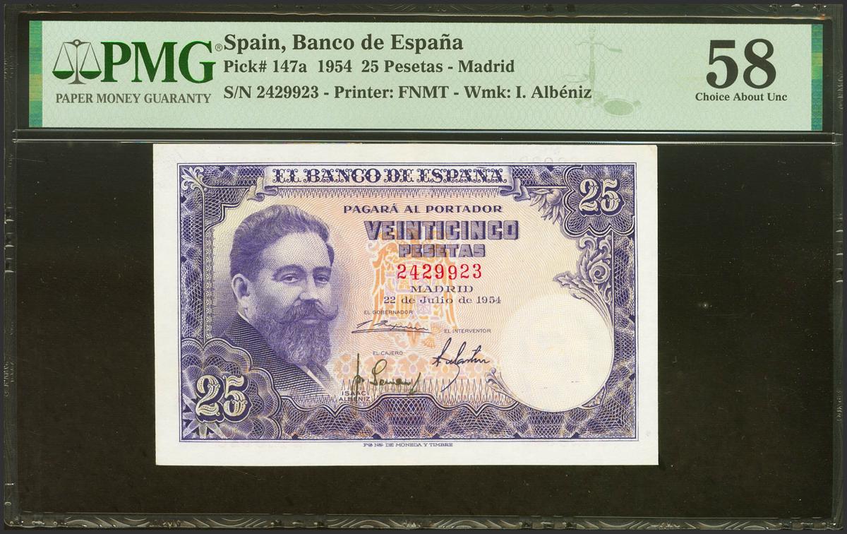 25 Pesetas. July 22, 1953. No series. (Edifil 2021: 467, Pick: 147a). EBC++. PMG58 encapsulation.