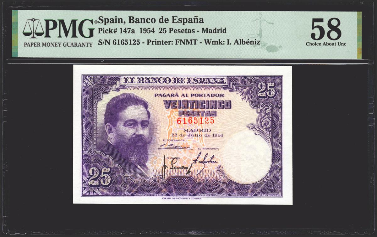English 25 Pesetas. July 22, 1953. No series. (Edifil 2021: 467, Pick: 147a). EBC++. PMG58 encapsulation.