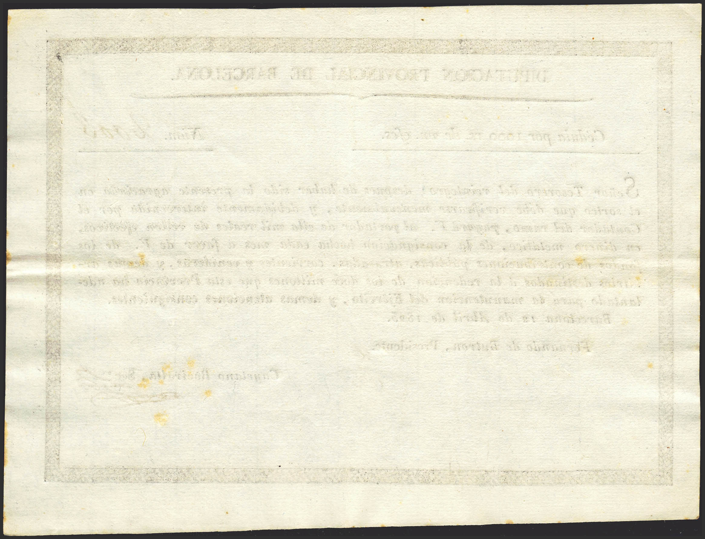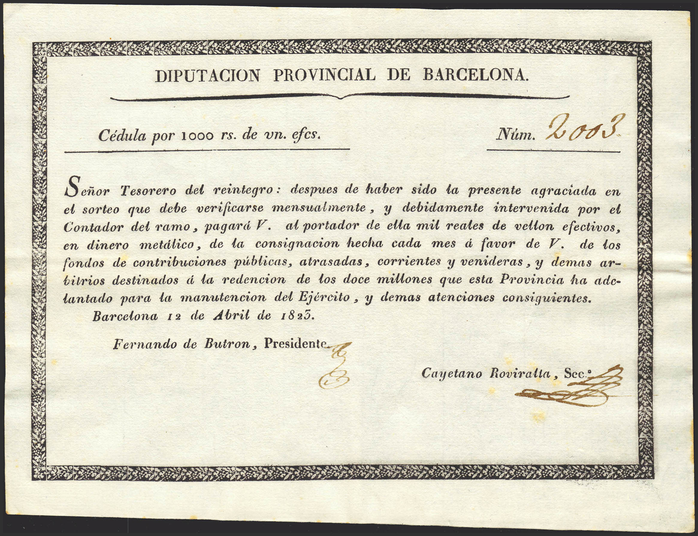1000 Reales. April 12, 1823. Cash debt for the maintenance of the Army and other consequent services (not cataloged in the work Titles of the Public Debt of the General Directorate of the Treasury, without a doubt the most important work of this period). Extraordinarily rare. Almost Extremely Fine.