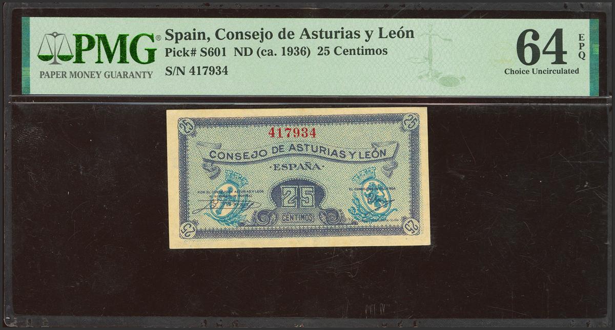 25 Cents. 1937. Asturias and León. (Edifil 2021: 394, Pick: S601). Original sizing. Uncirculated. PMG64EPQ package.