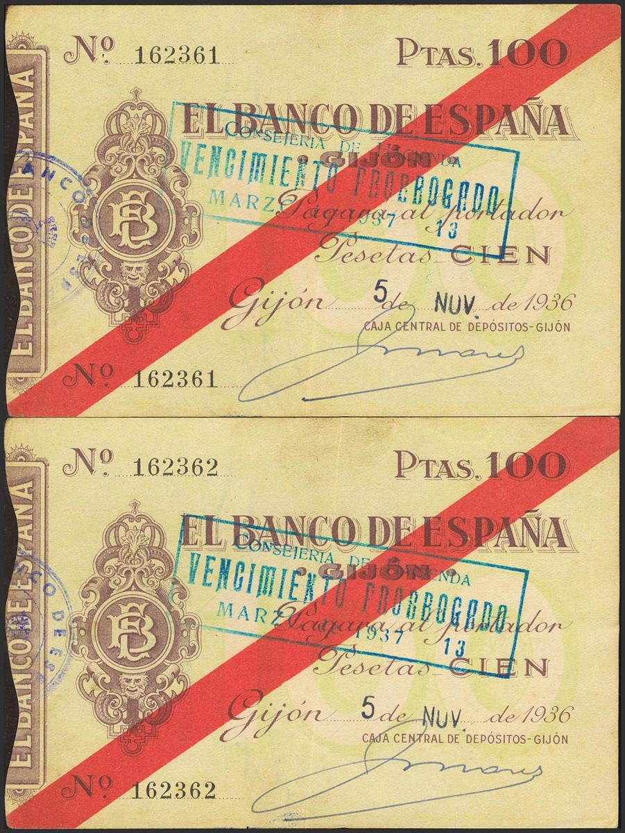 100 Pesetas. November 5, 1936. Gijón Branch. Correlative couple. No serie. (Edifil 2021: 384). Very rare pair, especially in this exceptional quality for this note, which is always in low qualities. Good Extremely Fine.