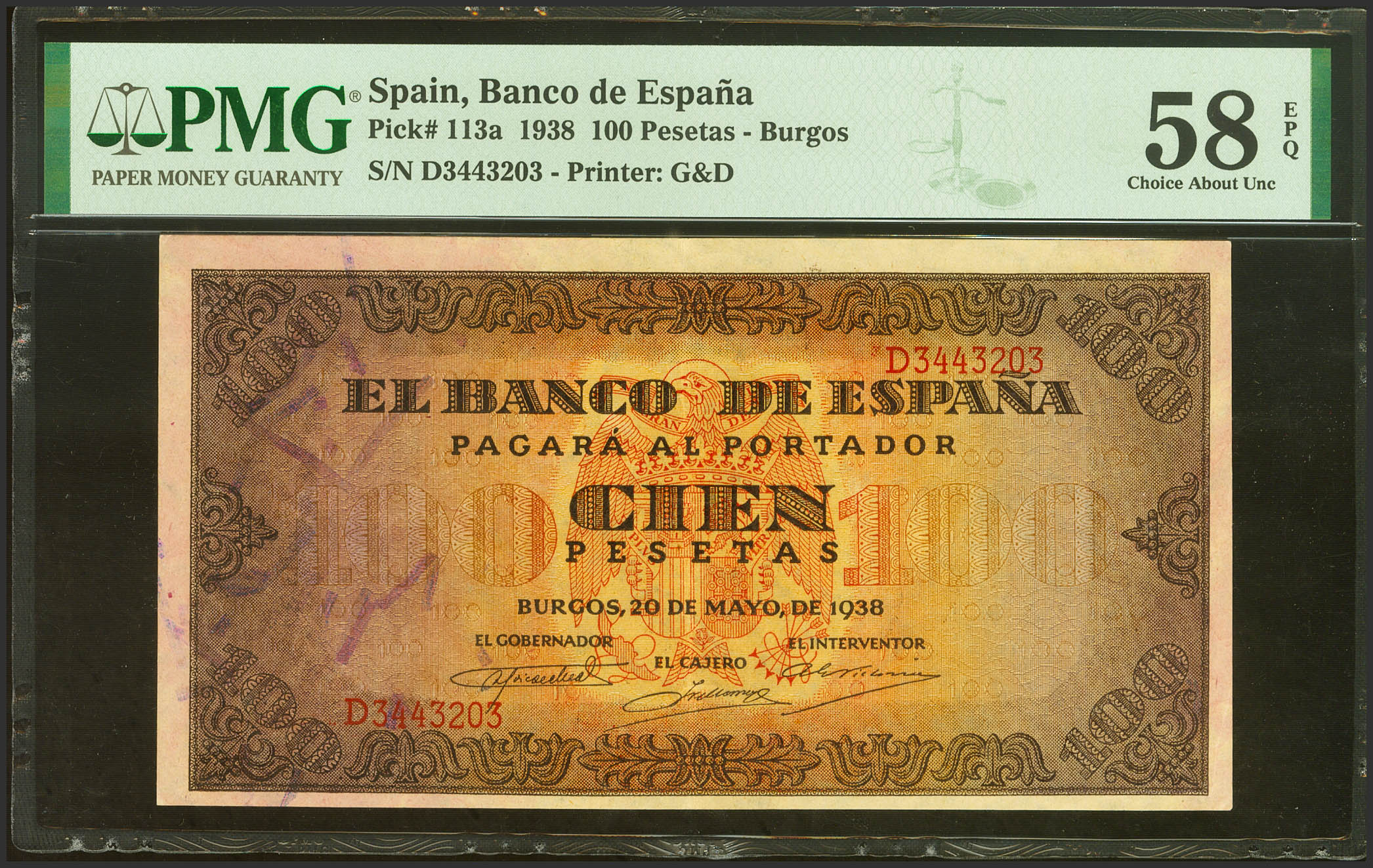 100 Pesetas. May 20, 1938. Series D. (Edifil 2021: 432a, Pick: 113a). Original sizing. EBC+++. PMG58EPQ package.