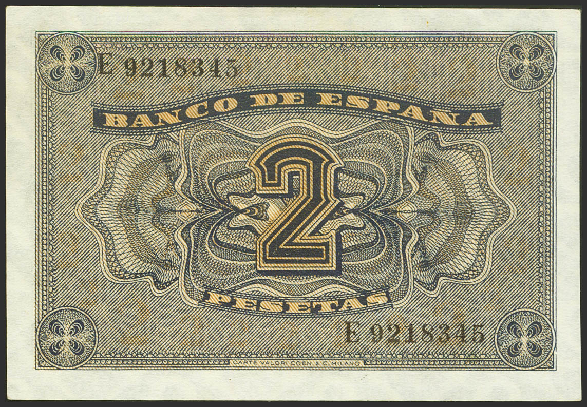 English 2 Pesetas. April 30, 1938. Series E. (Edifil 2021: 429a). Original sizing. Uncirculated.