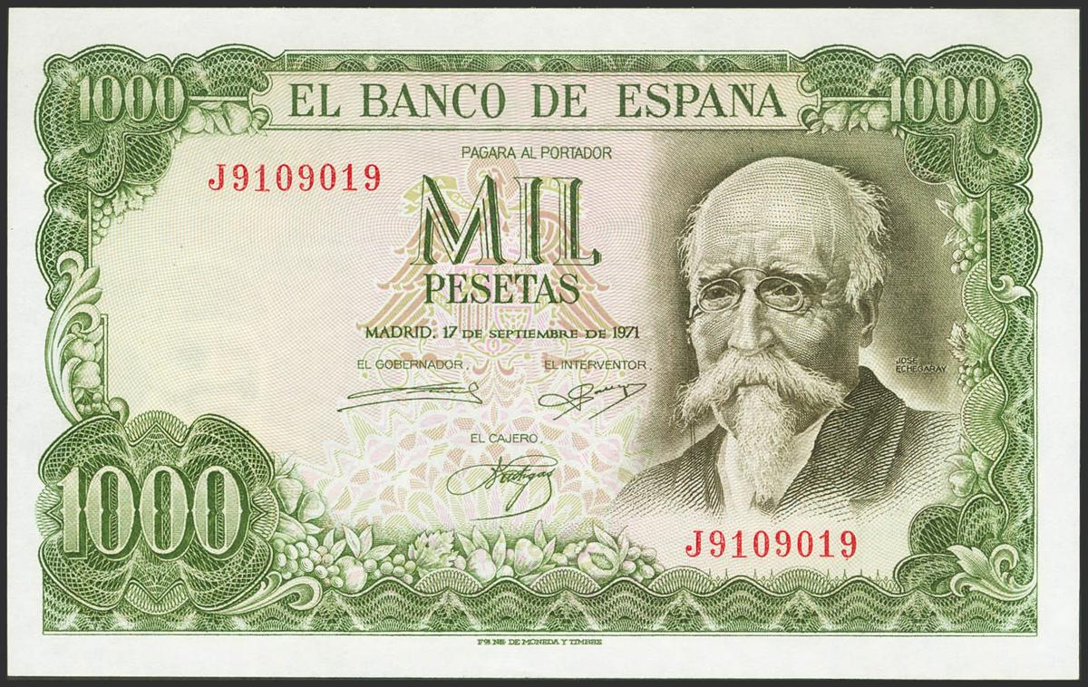 1000 Pesetas. September 17, 1971. Series J and capicúa numbering. (Edifil 2021: 474c). Original sizing. Uncirculated.