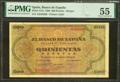 500 Pesetas. May 20, 1938. Series A. (Edifil 2023: 433, Pick: 114a). Unusual in this quality. Good Extremely Fine. PMG55 encapsulation.