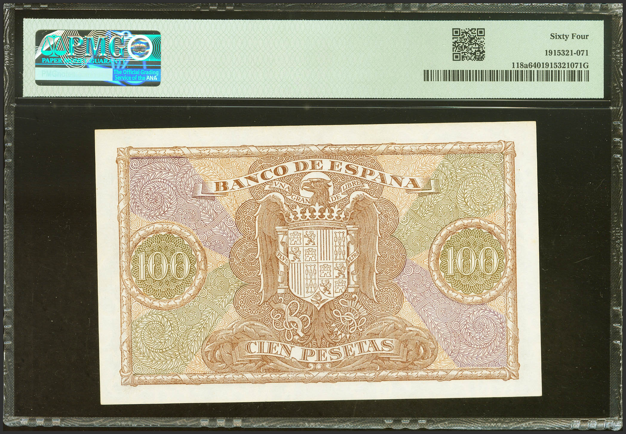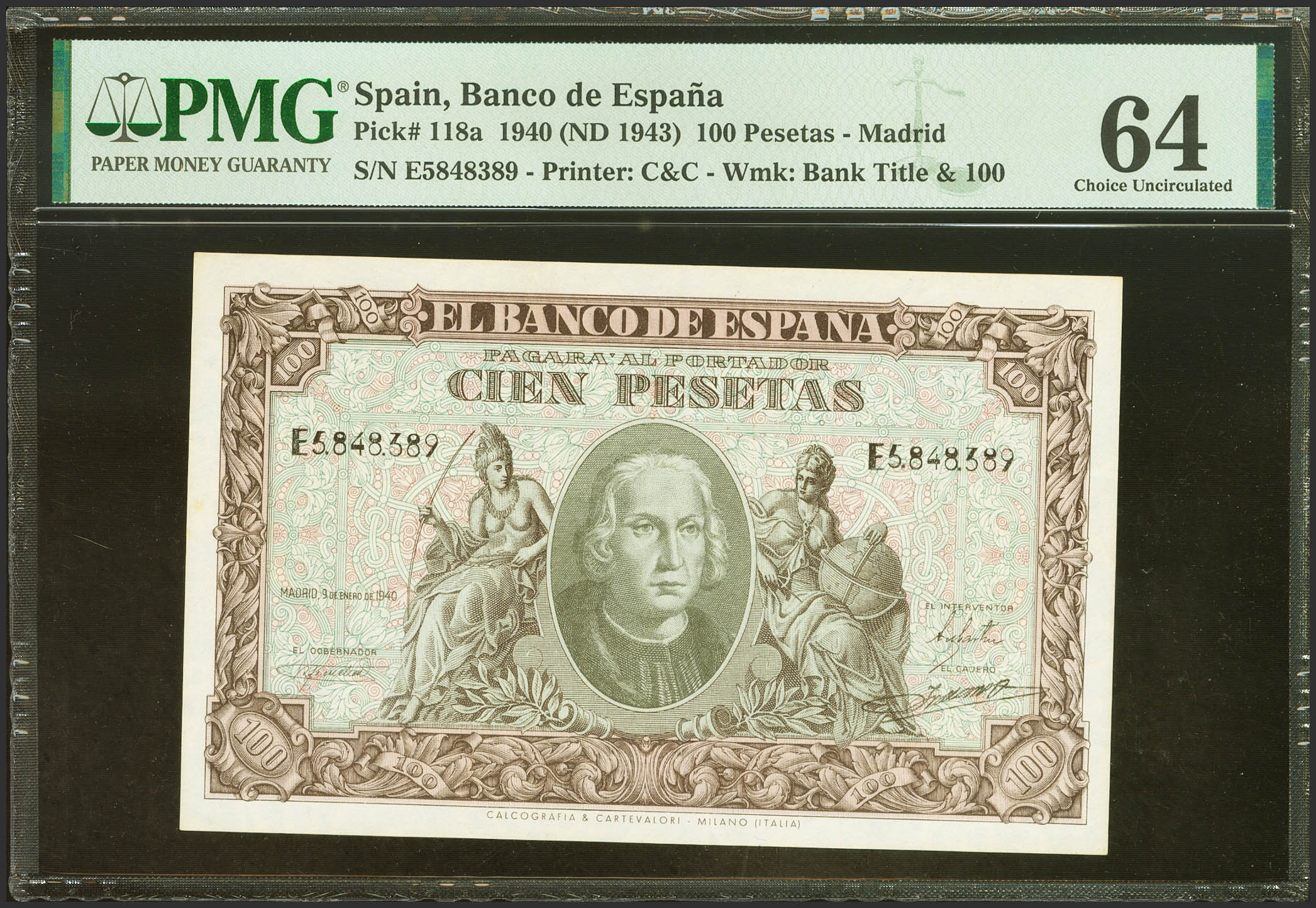 100 Pesetas. January 9, 1940. Series E. (Edifil 2023: 438a, Pick: 118a). Unusual in this quality. Uncirculated. PMG64 encapsulation.