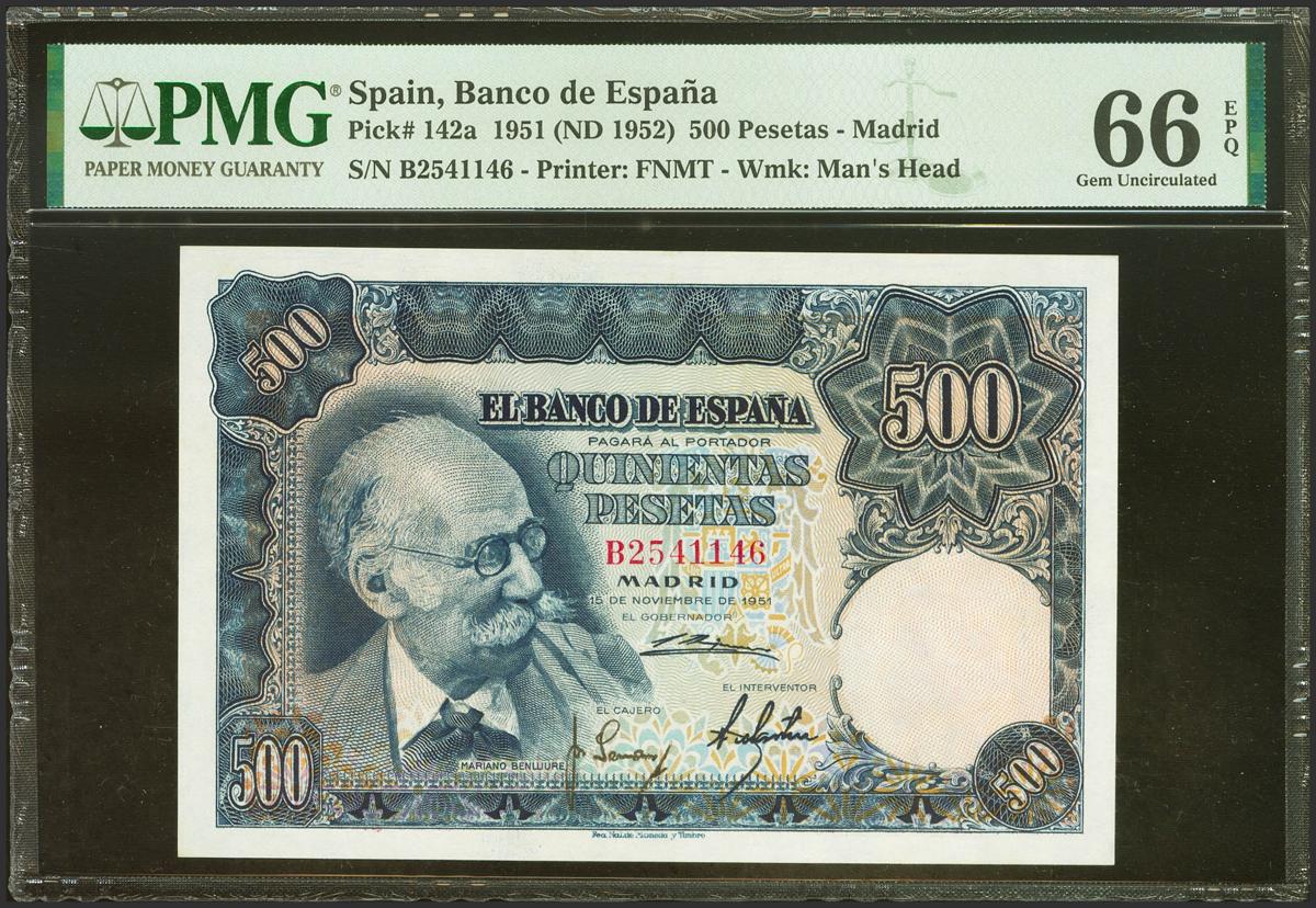 500 Pesetas. November 15, 1951. Series B. (Edifil 2023: 460a, Pick: 142a). Very rare in this exceptional quality, original sizing. Uncirculated. PMG66EPQ package.