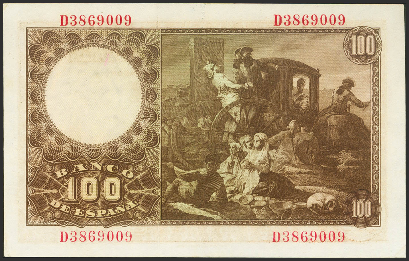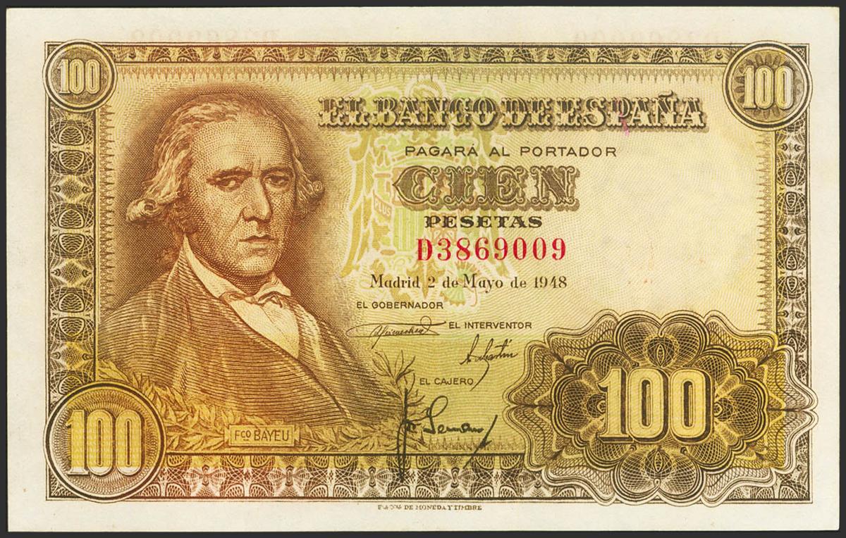 100 Pesetas. May 2, 1948. Series D. (Edifil 2023: 456a). It retains much of the original finish. Good Extremely Fine.