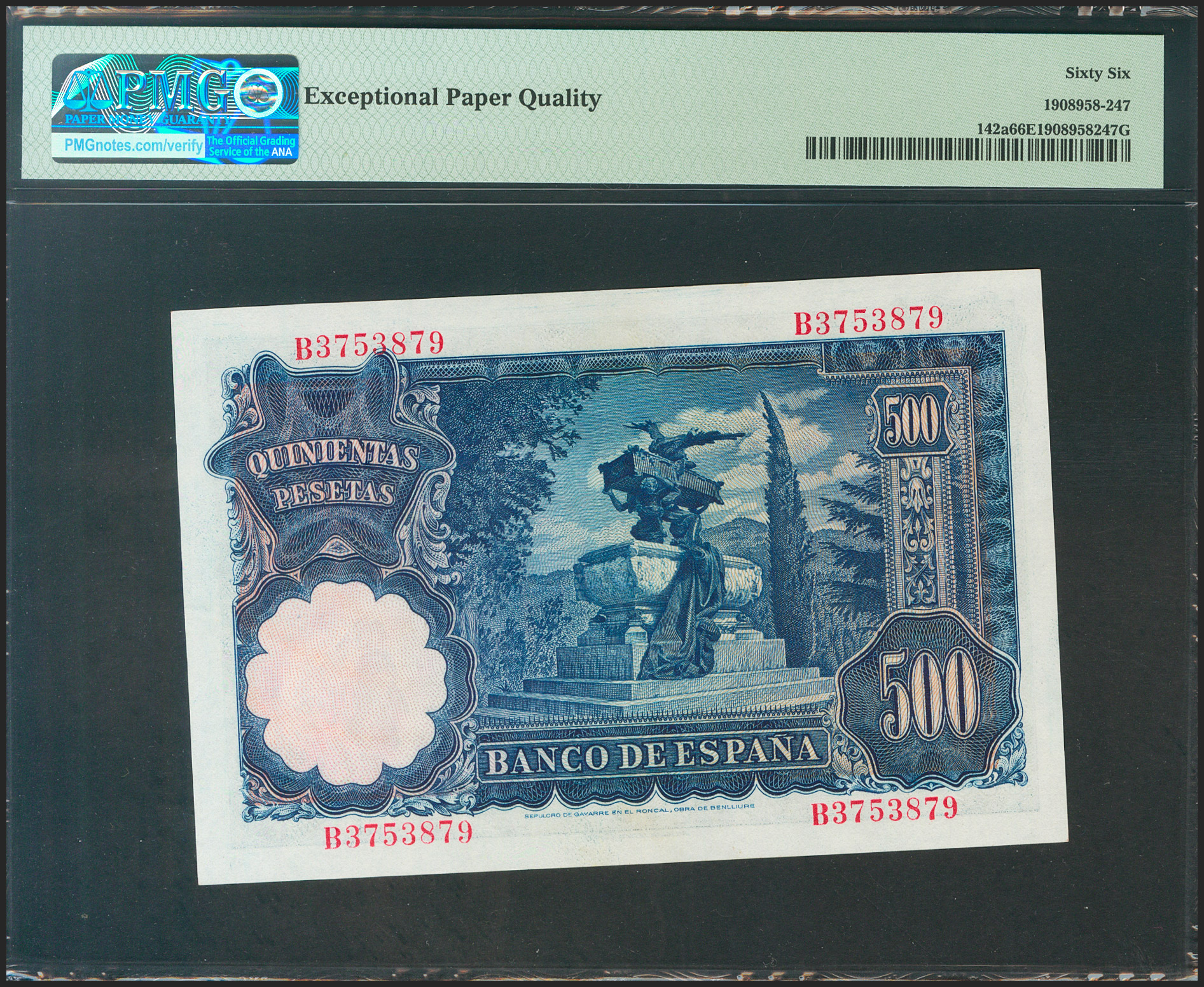 500 Pesetas. 15 de Noviembre de 1951. Serie B. (Edifil 2021: 460a, Pick: 142a). RarÃsimo en esta calidad, conserva todo su apresto original. SC. Encapsulado PMG66EPQ.