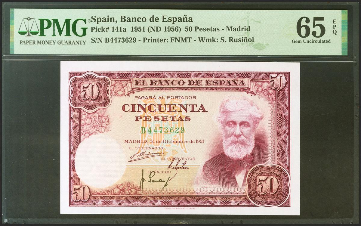50 Pesetas. 31 de Diciembre de 1951. Serie B. (Edifil 2021: 462a, Pick: 141a). Inusual en esta calidad, apresto original. SC. Encapsulado PMG65EPQ.