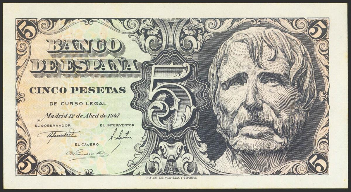 5 Pesetas. 12 de Abril de 1947. Serie C. (Edifil 2021: 454a). Conserva parte del apresto original. SC-.