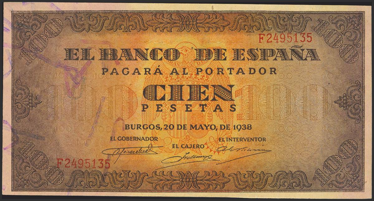 100 Pesetas. 20 de Mayo de 1938. Serie F. (Edifil 2023: 432a, Pick: 113). Inusual en esta calidad, conserva todo su apresto original. SC-.