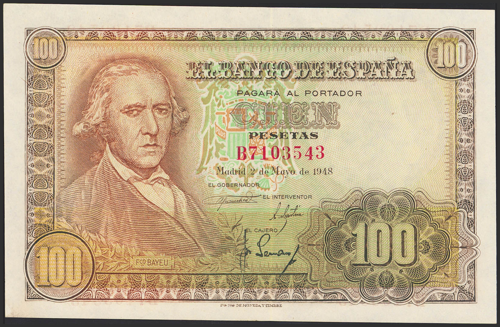 100 Pesetas. 2 de Mayo de 1948. Serie B. (Edifil 2023: 456a). Conserva gran parte de su apresto original. SC--.