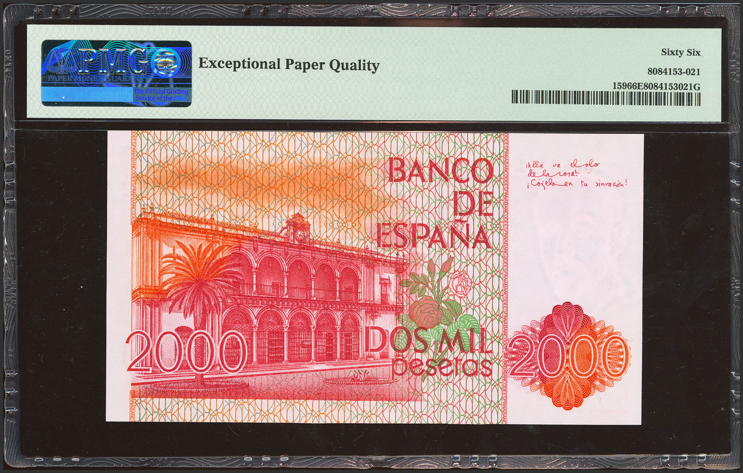 2000 Pesetas. 22 de Julio de 1980. Sin serie y numeración baja. (Edifil 2023: 479, Pick: 159). Inusual en esta excepcional calidad. SC. Encapsulado PMG66EPQ.