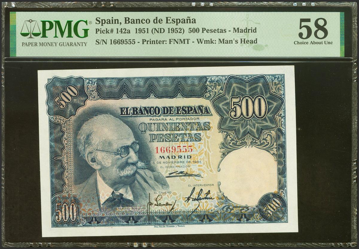 500 Pesetas. November 15, 1951. No series. (Edifil 2021: 460, Pick: 142a). Good Extremely Fine+. Encapsulated PMG58.